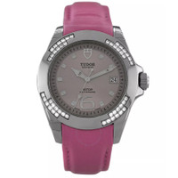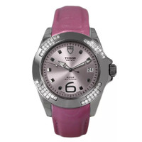 Silver-tone stainless steel case with a pink leather strap. Fixed silver-tone bezel with diamond set stainless steel. Purple dial with silver-tone hands and Arabic numeral & index hour markers. Minute markers around the outer rim. Dial Type: Analog. Luminescent hands. Date display at the 3 o'clock position. Automatic movement. Solid case back. Round case shape, case size: 39 mm. Band length: 7 inches. Fold over clasp with a safety release. Functions: date, hour, minute, second. Prince Date Series. Luxury watch style. Watch label: Swiss Made. Pre-owned Tudor Prince Date Automatic Diamond Purple Dial Ladies Watch 79440P. GENERAL Collection Name: Prince Date INFORMATION Brand: Tudor Series: Prince Date Model: 79440P Gender: Womens Watch Label: Swiss Made Movement: Automatic CONDITION INFORMATION Box: No Preowned Item Condition: Unworn / Like New Papers: No CASE Case Size: 39 Case Material: Stainless Steel Case Shape: Round Case Back: Solid DIAL Type: Analog Dial Color: Purple Hands: Silver-tone Second Markers: Minute Markers around the outer rim Dial Markers: Arabic Numeral & Index Luminiscence: Hands Bezel: Fixed Bezel Color: Silver-tone Bezel Material: Diamond Set Stainless Steel BAND Band Type: Strap Band Material: Leather Band Color: Pink Band Length: 7 inches Clasp: Fold Over with Safety Release FEATURES Calendar: Date display at the 3 o'clock position Functions: Date, Hour, Minute, Second Watch Features: Analog, Leather, Stainless Steel, Diamond ADDITIONAL INFO Watch Style: Luxury Warranty: 1 Year Jomashop Warranty Jomashop Sku: PRE-P-TUD88824 Department: Watches