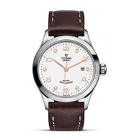 Silver-tone stainless steel case with a brown leather strap. Fixed silver-tone stainless steel bezel. White dial with rose gold-tone hands and alternating Arabic numeral and diamond hour markers. Minute markers around the outer rim. Dial Type: Analog. Date display at the 3 o'clock position. Tudor Calibre T201 Automatic movement, based upon ETA 2671, containing 25 Jewels, bitting at 28800 vph, and has a power reserve of approximately 38 hours. Scratch resistant sapphire crystal. Screw down crown. Round case shape, case size: 28 mm. Fold over clasp with a safety release. Water resistant at 100 meters / 330 feet. Functions: date, hour, minute, second. 1926 Series. Luxury watch style. Watch label: Swiss Made. Tudor 1926 Automatic Diamond White Dial Ladies Watch M91350-0014. INFORMATION Brand: Tudor Series: 1926 Collection Name: 1926 Gender: Womens Model: M91350-0014 Watch Label: Swiss Made Movement: Automatic Engine: Tudor Calibre T201 Power Reserve: 38 hours CASE Case Size: 28 mm Case Material: Stainless Steel Case Shape: Round BAND Band Material: Leather Band Type: Strap Band Color: Brown Clasp: Fold Over with Safety Release DIAL Dial Color: White Type: Analog Crystal: Scratch Resistant Sapphire Hands: Rose Gold-tone Dial Markers: Alternating Arabic Numeral and Diamond Second Markers: Minute Markers around the outer rim Bezel: Fixed Bezel Color: Silver-tone Bezel Material: Stainless Steel Crown: Screw Down FEATURES Water Resistance: 100 meters / 330 feet Calendar: Date display at the 3 o'clock position Functions: Date, Hour, Minute, Second Watch Features: Diamond, Stainless Steel, Leather, Gold, Analog ADDITIONAL INFO Watch Style: Luxury Warranty: 2 Year Jomashop Warranty Jomashop Sku: TUDM91350-0014 Item Variation: 91350-0014 Department: Watches Category: Watches