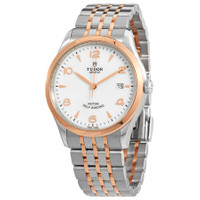 Stainless steel case with a stainless steel bracelet with rose gold links. Fixed rose gold bezel. White dial with rose gold-tone hands and alternating Arabic numeral and index hour markers. Minute markers around the outer rim. Dial Type: Analog. Date display at the 3 o'clock position. Tudor calibre T601 automatic movement, based upon ETA 2824, containing 25 Jewels, bitting at 28800 vph, and has a power reserve of approximately 38 hours. Scratch resistant sapphire crystal. Screw down crown. Solid case back. Round case shape. Case size: 39 mm. Fold over clasp. Water resistant at 100 meters / 330 feet. Functions: date, hour, minute, second. 1926 Series. Luxury watch style. Watch label: Swiss Made. Tudor 1926 Automatic White Dial Men's Watch 91551-0009. INFORMATION Brand: Tudor Series: 1926 Collection Name: 1926 Gender: Mens Model: M91551-0009 Watch Label: Swiss Made Movement: Automatic Engine: Tudor Calibre T601 Power Reserve: 38 hours CASE Case Size: 39 mm Case Material: Stainless Steel Case Shape: Round Case Back: Solid BAND Band Material: Stainless Steel with Rose Gold Links Band Type: Bracelet Band Color: Silver-tone Clasp: Fold Over DIAL Dial Color: White Type: Analog Crystal: Scratch Resistant Sapphire Hands: Rose Gold-tone Dial Markers: Alternating Arabic Numeral and Index Second Markers: Minute Markers around the outer rim Bezel: Fixed Bezel Color: Rose Gold-tone Bezel Material: Rose Gold Crown: Screw Down FEATURES Water Resistance: 100 meters / 330 feet Calendar: Date display at the 3 o'clock position Functions: Date, Hour, Minute, Second Watch Features: Stainless Steel, Gold, Analog ADDITIONAL INFO Watch Style: Luxury Warranty: 2 Year Jomashop Warranty Jomashop Sku: TUD91551-0009 Item Variation: 91551-0009 Department: Watches Category: Watches