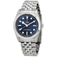 Silver-tone stainless steel case and bracelet. Fixed silver-tone stainless steel bezel. Blue dial with silver-tone hands and index hour markers. Minute markers around the outer rim. Dial Type: Analog. Luminescent hands and markers. Tudor Calibre MT5201 automatic movement. Scratch resistant sapphire crystal. Screw down crown. Round case shape, case size: 31 mm. Fold over clasp with a safety release. Water resistant at 100 meters / 330 feet. Functions: hour, minute, second, chronometer. Black Bay 31 Series. Luxury watch style. Watch label: Swiss Made. Tudor Black Bay 31 Automatic Chronometer Blue Dial Ladies Watch M79600-0002. INFORMATION Brand: Tudor Series: Black Bay 31 Collection Name: Black Bay 31 Gender: Womens Model: M79600-0002 Watch Label: Swiss Made Movement: Automatic Engine: Tudor Calibre MT5201 CASE Case Size: 31 mm Case Material: Stainless Steel Case Shape: Round BAND Band Material: Stainless Steel Band Type: Bracelet Band Color: Silver-tone Clasp: Fold Over with Safety Release DIAL Dial Color: Blue Type: Analog Crystal: Scratch Resistant Sapphire Hands: Silver-tone Dial Markers: Index Second Markers: Minute Markers around the outer rim Luminiscence: Hands and Markers Bezel: Fixed Bezel Color: Silver-tone Bezel Material: Stainless Steel Crown: Screw Down FEATURES Water Resistance: 100 meters / 330 feet Functions: Hour, Minute, Second, Chronometer Watch Features: Stainless Steel, Chronometer, Analog ADDITIONAL INFO Watch Style: Luxury Warranty: 2 Year Jomashop Warranty Jomashop Sku: TUDM79600-0002 Department: Watches Category: Watches