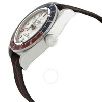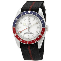 Silver-tone stainless steel case with a black fabric strap. Bi-directional rotating burgundy and blue aluminium bezel. Opaline dial with silver-tone hands and index hour markers. Minute markers around the outer rim. Dial Type: Analog. Luminescent hands and markers. Date display at the 3 o'clock position. Tudor Calibre MT5652 Automatic movement, containing 26 Jewels, bitting at 28800 vph, and has a power reserve of approximately 70 hours. Scratch resistant sapphire crystal. Screw down crown. Round case shape, case size: 41 mm. Tang clasp. Water resistant at 200 meters / 660 feet. Functions: date, GMT, second time zone, hour, minute, second, chronometer. Black Bay Gmt Series. Luxury watch style. Watch label: Swiss Made. Tudor Black Bay GMT GMT Automatic Chronometer Opaline Dial Men's Watch M79830RB-0012. INFORMATION Brand: Tudor Series: Black Bay Gmt Collection Name: Black Bay GMT Gender: Mens Model: M79830RB-0012 Watch Label: Swiss Made Movement: Automatic Engine: Tudor Calibre MT5652 Power Reserve: 70 hours CASE Case Size: 41 mm Case Material: Stainless Steel Case Shape: Round BAND Band Material: Fabric Band Type: Strap Band Color: Black Clasp: Tang DIAL Dial Color: Opaline Type: Analog Crystal: Scratch Resistant Sapphire Hands: Silver-tone Dial Markers: Index Second Markers: Minute Markers around the outer rim Luminiscence: Hands and Markers Bezel: Bi-directional Rotating Bezel Color: Burgundy and Blue Bezel Material: Aluminium Crown: Screw Down FEATURES Water Resistance: 200 meters / 660 feet Calendar: Date display at the 3 o'clock position Functions: Date, GMT, Second Time Zone, Hour, Minute, Second, Chronometer Watch Features: Time Zone, Stainless Steel, Chronometer, GMT, Analog ADDITIONAL INFO Watch Style: Luxury Warranty: 2 Year Jomashop Warranty Jomashop Sku: TUDM79830RB-0012 Department: Watches Category: Watches