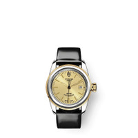 Two-tone (silver-tone and gold-tone) stainless steel case with a black leather strap. Fixed two-tone (silver-tone and gold-tone) stainless steel bezel. Champagne dial with gold-tone hands and index hour markers. Minute markers around the outer rim. Dial Type: Analog. Date display at the 3 o'clock position. Tudor Calibre T201 Automatic movement, based upon ETA 2671, containing 25 Jewels, bitting at 28800 vph, and has a power reserve of approximately 38 hours. Scratch resistant sapphire crystal. Screw down crown. Solid case back. Round case shape, case size: 26 mm. Fold over clasp with a safety release. Water resistant at 100 meters / 330 feet. Functions: date, hour, minute, second. Glamour Date Series. Luxury watch style. Watch label: Swiss Made. Item Variations: M51003-0020. Tudor Glamour Date Automatic Champagne Dial Ladies Watch 51003-0020. INFORMATION Brand: Tudor Series: Glamour Date Collection Name: Glamour Date Gender: Womens Model: 51003-0020 Watch Label: Swiss Made Movement: Automatic Engine: Tudor Calibre T201 Power Reserve: 38 hours CASE Case Size: 26 mm Case Material: Stainless Steel Case Shape: Round Case Back: Solid BAND Band Material: Leather Band Type: Strap Band Color: Black Clasp: Fold Over with Safety Release DIAL Dial Color: Champagne Type: Analog Crystal: Scratch Resistant Sapphire Hands: Gold-tone Dial Markers: Index Second Markers: Minute Markers around the outer rim Bezel: Fixed Bezel Color: Two-tone (Silver-tone and Gold-tone) Bezel Material: Stainless Steel Crown: Screw Down FEATURES Water Resistance: 100 meters / 330 feet Calendar: Date display at the 3 o'clock position Functions: Date, Hour, Minute, Second Watch Features: Stainless Steel, Leather, Gold, Analog ADDITIONAL INFO Watch Style: Luxury Warranty: 2 Year Jomashop Warranty Jomashop Sku: TUD51003-0020 Item Variation: M51003-0020 Department: Watches Category: Watches