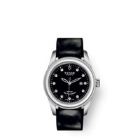 Silver-tone stainless steel case with a black leather strap. Fixed silver-tone stainless steel bezel. Black dial with silver-tone hands and diamond hour markers. Minute markers around the outer rim. Dial Type: Analog. Luminescent hands. Date display at the 3 o'clock position. Tudor Calibre T201 Automatic movement, based upon ETA 2671, containing 25 Jewels, bitting at 28800 vph, and has a power reserve of approximately 38 hours. Scratch resistant sapphire crystal. Screw down crown. Solid case back. Round case shape, case size: 31 mm. Fold over clasp with a safety release. Water resistant at 100 meters / 330 feet. Functions: date, hour, minute, second. Glamour Date Series. Luxury watch style. Watch label: Swiss Made. Item Variations: M53000-0045. Tudor Glamour Date Automatic Diamond Black Dial Ladies Watch 53000-0045. INFORMATION Brand: Tudor Series: Glamour Date Collection Name: Glamour Date Gender: Womens Model: 53000-0045 Watch Label: Swiss Made Movement: Automatic Engine: Tudor Calibre T201 Power Reserve: 38 hours CASE Case Size: 31 mm Case Material: Stainless Steel Case Shape: Round Case Back: Solid BAND Band Material: Leather Band Type: Strap Band Color: Black Clasp: Fold Over with Safety Release DIAL Dial Color: Black Type: Analog Crystal: Scratch Resistant Sapphire Hands: Silver-tone Dial Markers: Diamond Second Markers: Minute Markers around the outer rim Luminiscence: Hands Bezel: Fixed Bezel Color: Silver-tone Bezel Material: Stainless Steel Crown: Screw Down FEATURES Water Resistance: 100 meters / 330 feet Calendar: Date display at the 3 o'clock position Functions: Date, Hour, Minute, Second Watch Features: Diamond, Stainless Steel, Leather, Analog ADDITIONAL INFO Watch Style: Luxury Warranty: 2 Year Jomashop Warranty Jomashop Sku: TUD53000-0045 Item Variation: M53000-0045 Department: Watches Category: Watches