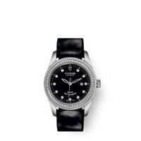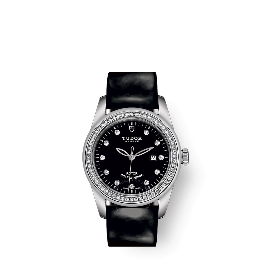 Silver-tone stainless steel case with a black leather strap. Fixed silver-tone bezel with diamond set. Black dial with silver-tone hands and diamond hour markers. Minute markers around the outer rim. Dial Type: Analog. Date display at the 3 o'clock position. Tudor Calibre T201 Automatic movement, based upon ETA 2671, containing 25 Jewels, bitting at 28800 vph, and has a power reserve of approximately 38 hours. Scratch resistant sapphire crystal. Screw down crown. Solid case back. Round case shape, case size: 31 mm. Fold over clasp with a safety release. Water resistant at 100 meters / 330 feet. Functions: date, hour, minute, second. Additional Info: steel double bezel set with 60 diamonds, with polished finish. Glamour Date Series. Luxury watch style. Watch label: Swiss Made. Item Variations: M53020-0048. Tudor Glamour Date Automatic Diamond Black Dial Ladies Watch 53020-0048. INFORMATION Brand: Tudor Series: Glamour Date Collection Name: Glamour Date Gender: Womens Model: 53020-0048 Watch Label: Swiss Made Movement: Automatic Engine: Tudor Calibre T201 Power Reserve: 38 hours CASE Case Size: 31 mm Case Material: Stainless Steel Case Shape: Round Case Back: Solid BAND Band Material: Leather Band Type: Strap Band Color: Black Clasp: Fold Over with Safety Release DIAL Dial Color: Black Type: Analog Crystal: Scratch Resistant Sapphire Hands: Silver-tone Dial Markers: Diamond Second Markers: Minute Markers around the outer rim Bezel: Fixed Bezel Color: Silver-tone Bezel Material: Diamond Set Crown: Screw Down FEATURES Water Resistance: 100 meters / 330 feet Calendar: Date display at the 3 o'clock position Functions: Date, Hour, Minute, Second Watch Features: Diamond, Stainless Steel, Leather, Analog ADDITIONAL INFO Watch Style: Luxury Warranty: 2 Year Jomashop Warranty Additional Info: Steel double bezel set with 60 diamonds, with polished finish Jomashop Sku: TUD53020-0048 Item Variation: M53020-0048 Department: Watches Category: Watches