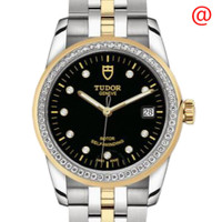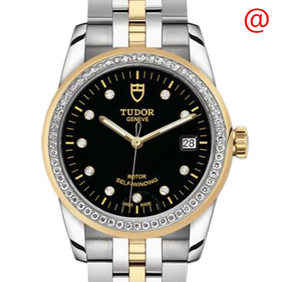 Silver-tone stainless steel case with a two-tone stainless steel and 18kt gold bracelet. Fixed bezel with diamond set. Black dial with yellow gold-tone hands and diamond hour markers. Minute markers around the outer rim. Dial Type: Analog. Luminescent hands. Date display at the 3 o'clock position. Automatic movement. Scratch resistant sapphire crystal. Solid case back. Round case shape, case size: 36 mm. Fold over clasp with a safety release. Functions: date, hour, minute, second. Additional Info: original box, international warranty card, manual (complete accessories). Glamour Date Series. Luxury watch style. Watch label: Swiss Made. Tudor Glamour Date Automatic Diamond Black Dial Ladies Watch 55023-0022. INFORMATION Brand: Tudor Series: Glamour Date Collection Name: Glamour Date Gender: Womens Model: 55023-0022 Watch Label: Swiss Made Movement: Automatic CASE Case Size: 36 mm Case Material: Stainless Steel Case Shape: Round Case Back: Solid BAND Band Material: Stainless Steel and 18kt Gold Band Type: Bracelet Band Color: Two-tone Clasp: Fold Over with Safety Release DIAL Dial Color: Black Type: Analog Crystal: Scratch Resistant Sapphire Hands: Yellow Gold-tone Dial Markers: Diamond Second Markers: Minute Markers around the outer rim Luminiscence: Hands Bezel: Fixed Bezel Material: Diamond Set FEATURES Calendar: Date display at the 3 o'clock position Functions: Date, Hour, Minute, Second Watch Features: Diamond, Stainless Steel, Gold, Analog ADDITIONAL INFO Watch Style: Luxury Warranty: 2 Year Jomashop Warranty Additional Info: Original Box, International Warranty Card, Manual (Complete Accessories) Jomashop Sku: TUD55023-0022 Department: Watches Category: Watches