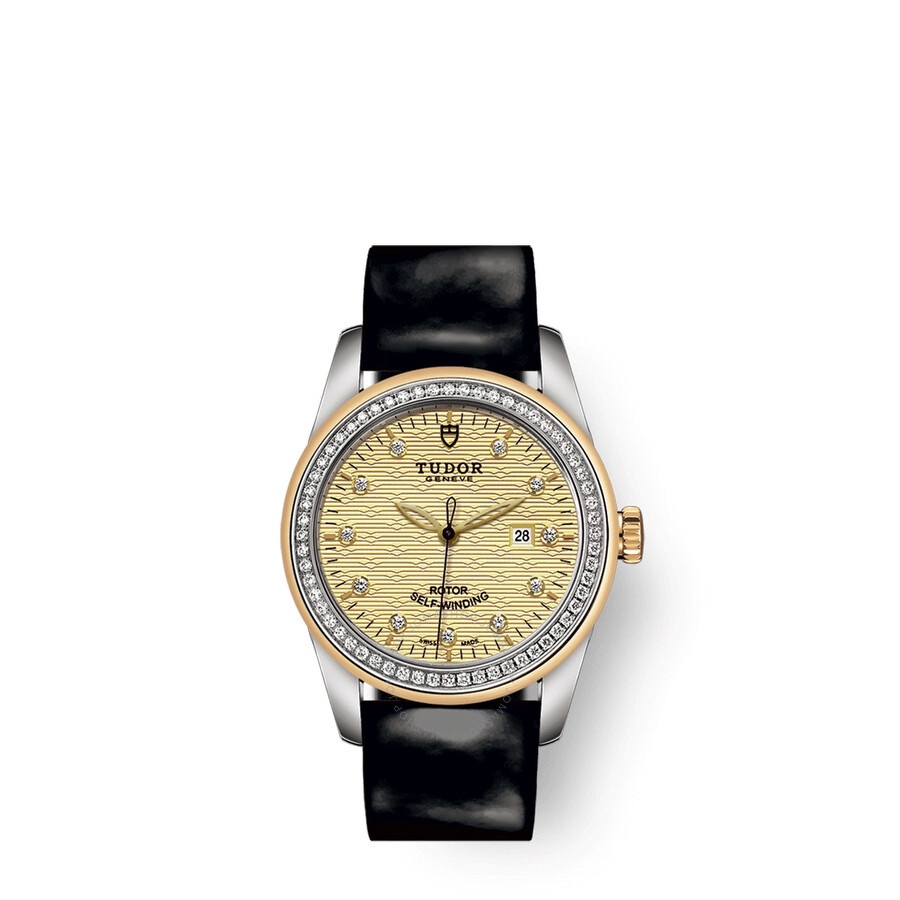 Silver-tone stainless steel case with a black leather strap. Fixed gold-tone bezel with diamond set. Champagne jacquard dial with gold-tone hands and diamond hour markers. Minute markers around the outer rim. Dial Type: Analog. Date display at the 3 o'clock position. Tudor Calibre T201 Automatic movement, based upon ETA 2671, containing 25 Jewels, bitting at 28800 vph, and has a power reserve of approximately 38 hours. Scratch resistant sapphire crystal. Screw down crown. Solid case back. Round case shape, case size: 31 mm. Fold over clasp with a safety release. Water resistant at 100 meters / 330 feet. Functions: date, hour, minute, second. Additional Info: steel and yellow gold double bezel set with 60 diamonds, with polished finish. Glamour Date Series. Luxury watch style. Watch label: Swiss Made. Item Variations: M53023-0047. Tudor Glamour Date Automatic Diamond Ladies Watch 53023-0047. INFORMATION Brand: Tudor Series: Glamour Date Collection Name: Glamour Date Gender: Womens Model: 53023-0047 Watch Label: Swiss Made Movement: Automatic Engine: Tudor Calibre T201 Power Reserve: 38 hours CASE Case Size: 31 mm Case Material: Stainless Steel Case Shape: Round Case Back: Solid BAND Band Material: Leather Band Type: Strap Band Color: Black Clasp: Fold Over with Safety Release DIAL Dial Color: Champagne Jacquard Type: Analog Crystal: Scratch Resistant Sapphire Hands: Gold-tone Dial Markers: Diamond Second Markers: Minute Markers around the outer rim Bezel: Fixed Bezel Color: Gold-tone Bezel Material: Diamond Set Crown: Screw Down FEATURES Water Resistance: 100 meters / 330 feet Calendar: Date display at the 3 o'clock position Functions: Date, Hour, Minute, Second Watch Features: Diamond, Stainless Steel, Leather, Gold, Analog ADDITIONAL INFO Watch Style: Luxury Warranty: 2 Year Jomashop Warranty Additional Info: Steel and yellow gold double bezel set with 60 diamonds, with polished finish Jomashop Sku: TUD53023-0047 Item Variation: M53023-0047 Department: Watches Category: Watches