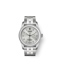 Silver-tone stainless steel case and bracelet. Fixed silver-tone stainless steel bezel. Silver-tone dial with silver-tone hands and diamond hour markers. Minute markers around the outer rim. Dial Type: Analog. Luminescent hands. Date display at the 3 o'clock position. Tudor Calibre T201 Automatic movement, based upon ETA 2671, containing 25 Jewels, bitting at 28800 vph, and has a power reserve of approximately 38 hours. Scratch resistant sapphire crystal. Solid case back. Case size: 31 mm. Fold over clasp with a safety release. Water resistant at 100 meters / 330 feet. Functions: date, hour, minute, second. Glamour Date Series. Luxury watch style. Watch label: Swiss Made. Item Variations: M53000-0003. Tudor Glamour Date Automatic Diamond Silver Dial Ladies Watch 53000-0003. INFORMATION Brand: Tudor Series: Glamour Date Collection Name: Glamour Date Gender: Womens Model: 53000-0003 Watch Label: Swiss Made Movement: Automatic Engine: Tudor Calibre T201 Power Reserve: 38 hours CASE Case Size: 31 mm Case Material: Stainless Steel Case Back: Solid BAND Band Material: Stainless Steel Band Type: Bracelet Band Color: Silver-tone Clasp: Fold Over with Safety Release DIAL Dial Color: Silver-tone Type: Analog Crystal: Scratch Resistant Sapphire Hands: Silver-tone Dial Markers: Diamond Second Markers: Minute Markers around the outer rim Luminiscence: Hands Bezel: Fixed Bezel Color: Silver-tone Bezel Material: Stainless Steel Crown: Screw Down FEATURES Water Resistance: 100 meters / 330 feet Calendar: Date display at the 3 o'clock position Functions: Date, Hour, Minute, Second Watch Features: Diamond, Stainless Steel, Analog ADDITIONAL INFO Watch Style: Luxury Warranty: 2 Year Jomashop Warranty Jomashop Sku: TUD53000-0003 Item Variation: M53000-0003 Department: Watches Category: Watches