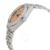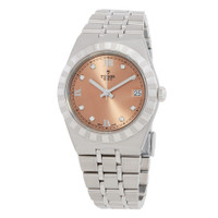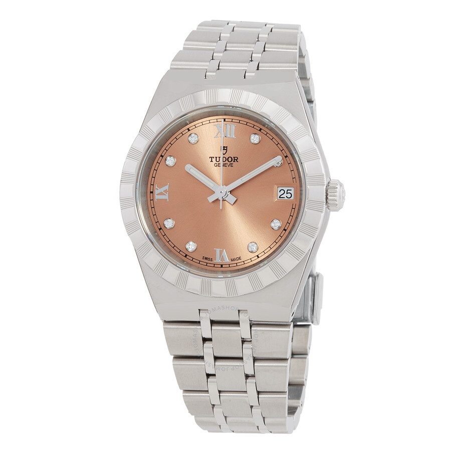 Silver-tone stainless steel case and bracelet. Fixed silver-tone stainless steel bezel. Salmon dial with silver-tone hands and diamond hour markers. Roman numeral marks the 3, 6, 9 and 12 o'clock positions. Minute markers around the outer rim. Dial Type: Analog. Luminescent hands. Date display at the 3 o'clock position. Tudor Calibre T601 Automatic movement, based upon ETA 2824, containing 25 Jewels, bitting at 28800 vph, and has a power reserve of approximately 38 hours. Scratch resistant sapphire crystal. Screw down crown. Solid case back. Round case shape, case size: 34 mm. Fold over clasp with a safety release. Water resistant at 100 meters / 330 feet. Functions: date, hour, minute, second. Royal Series. Luxury watch style. Watch label: Swiss Made. Tudor Royal Automatic Diamond Salmon Dial Ladies Watch M28400-0011. INFORMATION Brand: Tudor Series: Royal Collection Name: Royal Gender: Womens Model: M28400-0011 Watch Label: Swiss Made Movement: Automatic Engine: Tudor Calibre T601 Power Reserve: 38 hours CASE Case Size: 34 mm Case Material: Stainless Steel Case Shape: Round Case Back: Solid BAND Band Material: Stainless Steel Band Type: Bracelet Band Color: Silver-tone Clasp: Fold Over with Safety Release DIAL Dial Color: Salmon Type: Analog Crystal: Scratch Resistant Sapphire Hands: Silver-tone Dial Markers: Diamond Second Markers: Roman Numeral marks the 3, 6, 9 and 12 o'clock positions. Minute Markers around the outer rim Luminiscence: Hands Bezel: Fixed Bezel Color: Silver-tone Bezel Material: Stainless Steel Crown: Screw Down FEATURES Water Resistance: 100 meters / 330 feet Calendar: Date display at the 3 o'clock position Functions: Date, Hour, Minute, Second Watch Features: Diamond, Stainless Steel, Analog ADDITIONAL INFO Watch Style: Luxury Warranty: Salmon Jomashop Sku: TUDM28400-0011 Department: Watches Category: Watches