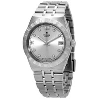 316L steel case with a 316L steel bracelet. Fixed 316L steel bezel. Silver dial with luminous silver-tone hands and diamond hour markers. Roman numerals appear at the 6, 9 and 12 o'clock positions. Minute markers around the outer rim. Dial Type: Analog. Luminescent hands. Date display at the 3 o'clock position. Tudor calibre T601 automatic movement with a 38-hour power reserve. Scratch resistant sapphire crystal. Screw down crown. Solid case back. Round case shape. Case size: 34 mm. Fold over clasp. Water resistant at 100 meters / 330 feet. Functions: date, hour, minute, second. Royal Series. Dress watch style. Watch label: Swiss Made. Tudor Royal Automatic Diamond Silver Dial 34 mm Watch M28400-0002. INFORMATION Brand: Tudor Series: Royal Collection Name: Royal Gender: Womens Model: M28400-0002 Watch Label: Swiss Made Movement: Automatic Engine: Tudor Calibre T601 Power Reserve: 38 hours CASE Case Size: 34 mm Case Material: 316L Steel Case Shape: Round Case Back: Solid BAND Band Material: 316L Steel Band Type: Bracelet Band Color: Silver-tone Clasp: Fold Over DIAL Dial Color: Silver Type: Analog Crystal: Scratch Resistant Sapphire Hands: Luminous Silver-tone Dial Markers: Diamond Second Markers: Roman Numerals appear at the 6, 9 and 12 o'clock positions. Minute Markers around the outer rim Luminiscence: Hands Bezel: Fixed Bezel Color: Silver-tone Bezel Material: 316L Steel Crown: Screw Down FEATURES Water Resistance: 100 meters / 330 feet Calendar: Date display at the 3 o'clock position Functions: Date, Hour, Minute, Second Watch Features: Diamond, Analog ADDITIONAL INFO Watch Style: Dress Warranty: 2 Year Jomashop Warranty Jomashop Sku: TUD28400-0002 Item Variation: 28400-0002 Department: Watches Category: Watches