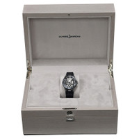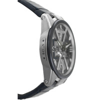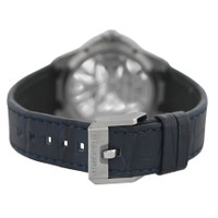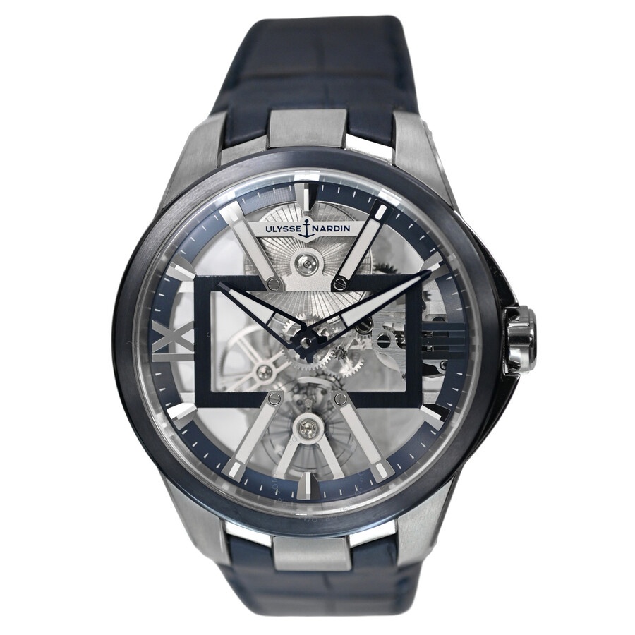 Pre-owned Silver-tone titanium case with a blue leather strap. Fixed black bezel. Transparent dial with blued hands and Roman numeral hour markers. Minute scale around the inner rim. Dial Type: Analog. Luminescent hands and markers. Ulysse Nardin Calibre UN-371 Hand Wind movement, containing 21 Jewels, composed of 173 parts, bitting at 21600 vph, and has a power reserve of approximately 96 hours. Scratch resistant sapphire crystal. Transparent see case back. Round case shape, case size: 42 mm. Buckle clasp. Water resistant at 50 meters / 165 feet. Functions: hours, minutes. balance wheel, escapement wheel, balance spring & anchor in silicium. Luxury watch style. Watch label: Swiss Made. Ulysse Nardin Automatic Men's Watch 3713-260/03. GENERAL Comments: This watch looks like a collector's piece, and it does not show signs of wear. It does not have any visible scratches to the naked eye. The strap shows some minimal imperfections on the inside, probably due to storage in the box. It comes in an original Ulysse Nardin box, but no papers. The box may have some slight imperfections due to storage. It passed the water pressure test, and we will include a printout of the test results. All functions are working, automatic movement is in good working CASE Case Material: Titanium Case Shape: Round Case Back: Transparent See BAND Band Material: Leather Band Type: Strap Band Color: Blue Clasp: Buckle DIAL Dial Color: Transparent Type: Analog Crystal: Scratch Resistant Sapphire Hands: Blued Dial Markers: Roman Numeral Second Markers: Minute Scale around the inner rim Luminiscence: Hands and Markers Bezel: Fixed Bezel Color: Black INFORMATION Brand: Ulysse Nardin Series: Blast Skeleton X Collection Name: Blast Skeleton X Gender: Mens Model: 3713-260/03 Watch Label: Swiss Made Movement: Hand Wind Engine: Ulysse Nardin Calibre UN-371 Power Reserve: 96 hours FEATURES Water Resistance: 50 meters / 165 feet Functions: Hours, minutes. Balance wheel, escapement wheel, balance spring & anchor in silicium Watch Features: Titanium, Leather, Analog ADDITIONAL INFO Watch Style: Luxury Warranty: 1 Year Jomashop Warranty Jomashop Sku: PRE-P-UN100566 Department: Watches
