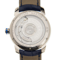 18kt white gold case with a blue alligator leather strap. Fixed diamond set bezel. Blue dial. Dial Type: Analog. Ulysse Nardin Calibre UN-815 automatic movement with a 42-hour power reserve. Scratch resistant sapphire crystal. Round case shape. Case size: 35 mm. Fold over clasp. Water resistant at 50 meters / 165 feet. Functions: hour, minute, second. Dress watch style. Watch label: Swiss Made. Ulysse Nardin CLASSIC Blue Dial Unisex Watch 8150-112-HUP. INFORMATION Brand: Ulysse Nardin Series: Classico Lady Collection Name: Classico Lady Gender: Womens Model: 8150-112-HUP Watch Label: Swiss Made Movement: Automatic Engine: Ulysse Nardin Calibre UN-815 Power Reserve: 42 hours CASE Case Size: 35 mm Case Material: 18kt White Gold Case Shape: Round BAND Band Material: Alligator Leather Band Type: Strap Band Color: Blue Clasp: Fold Over DIAL Dial Color: Blue Type: Analog Crystal: Scratch Resistant Sapphire Bezel: Fixed Bezel Material: Diamond Set FEATURES Water Resistance: 50 meters / 165 feet Functions: Hour, Minute, Second Watch Features: Diamond, Leather, Gold, Analog, Alligator Leather ADDITIONAL INFO Watch Style: Dress Warranty: 2 Year Jomashop Warranty Jomashop Sku: UN8150112HUP Department: Watches Category: Watches