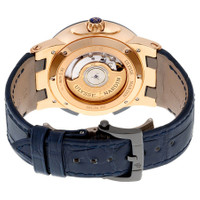 18kt rose gold case with a blue (alligator) leather strap. Fixed blue ceramic bezel. Blue dial with luminous rose gold hands and index hour markers. Roman numerals mark the 3, 6, 9 and 12 o'clock positions. Minute markers around the inner ring. Dial Type: Analog. Luminescent hands. Date display at the 1 o'clock position. Dual time display into a 9 o'clock position. Small seconds sub-dial at the 6 o'clock position. Automatic movement with a 42 hour power reserve. Scratch resistant sapphire crystal. Screw down crown. Skeleton case back. Case diameter: 43 mm. Case thickness: 12.6 mm. Round case shape. Strap width: 20 mm. Tang clasp. Water resistant at 100 meters / 330 feet. Functions: date, hour, minute, second, GMT dual time. Luxury watch style. Watch label: Swiss Made. Ulysse Nardin Executive Dual Time Automatic Blue Dial 18kt Rose Gold Men's Watch 246-00-5-43. CASE Case Size: 43 Case Thickness: 12.6 mm Case Material: 18kt Rose Gold Case Shape: Round Case Back: Skeleton BAND Band Material: Alligator Leather Band Type: Strap Band Color: Blue Band Width: 20 mm Clasp: Tang DIAL Dial Color: Blue Type: Analog Crystal: Scratch Resistant Sapphire Hands: Luminous Rose Gold Dial Markers: Index Second Markers: Roman Numerals mark the 3, 6, 9 and 12 o'clock positions. Minute Markers around the inner ring Sub Dials: Dual Time into a 9 o'clock position. Small Second Luminiscence: Hands Bezel: Fixed Bezel Color: Blue Bezel Material: Ceramic Crown: Screw Down INFORMATION Brand: Ulysse Nardin Series: Executive Dual Time Collection Name: Executive Dual Time Gender: Mens Model: 246-00-5-43 Watch Label: Swiss Made Movement: Automatic Engine: Ulysse Nardin Calibre UN-24 Power Reserve: 42 hours FEATURES Water Resistance: 100 meters / 330 feet Calendar: Date display at the 1 o'clock position Functions: GMT, Second Time Zone, Date, Hour, Minute, Second Watch Features: Alligator Leather, Analog, GMT, Ceramic, Gold, Leather, Time Zone ADDITIONAL INFO Watch Style: Luxury Warranty: 2 Year Jomashop Warranty UPC Code: 794504182842 Jomashop Sku: UN246-00-5-43 Department: Watches Category: Watches