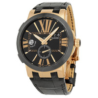 18kt rose gold case with a black leather strap. Fixed black ceramic bezel. Black dial with luminous 18kt rose gold hands and index hour markers. Minute markers. Roman numerals mark the 3, 6, 9 and 12 o'clock positions. Dial Type: Analog. Luminescent hands and markers. Date display at the 2 o'clock position. Seconds sub-dial above the 6 o'clock oposition. Dual time display at the 9 o'clock position. Automatic movement with a 42 hour power reserve. Scratch resistant sapphire crystal. Screw down 18kt rose gold crown. Transparent case back. Case diameter: 43 mm. Case thickness: 12 mm. Round case shape. Band width: 20 mm. Band length: 8 inches. Deployment clasp with push button release. Water resistant at 100 meters / 330 feet. Functions: date, hour, minute, second. Luxury watch style. Watch label: Swiss Made. Ulysse Nardin Executive Dual Time Men's Watch 246-00-42. GENERAL Color: Black / Gold / Rose CASE Case Size: 43 Case Thickness: 12 mm Case Material: 18kt Rose Gold Case Shape: Round Case Back: Transparent BAND Band Material: Leather Band Type: Strap Band Color: Black Band Length: 8 inches Band Width: 20 mm Clasp: Deployment with Push Button Release DIAL Dial Color: Black Type: Analog Crystal: Scratch Resistant Sapphire Hands: Luminous 18kt Rose Gold Dial Markers: Index Second Markers: Roman Numerals mark the 3, 6, 9 and 12 o'clock positions Sub Dials: Second above the 6 o'clock oposition. Dual time at the 9 o'clock position Luminiscence: Hands and Markers Bezel: Fixed Bezel Color: Black Bezel Material: Ceramic Crown: Screw Down 18kt Rose Gold INFORMATION Brand: Ulysse Nardin Series: Executive Dual Time Collection Name: Executive Dual Time Gender: Mens Model: 246-00/42 Watch Label: Swiss Made Movement: Automatic Engine: Ulysse Nardin Calibre UN-24 Power Reserve: 42 hours FEATURES Water Resistance: 100 meters / 330 feet Calendar: Date display at the 2 o'clock position Functions: GMT, Second Time Zone, Date, Hour, Minute, Second Watch Features: Analog, GMT, Ceramic, Gold, Leather, Time Zone ADDITIONAL INFO Watch Style: Luxury Warranty: 2 Year Jomashop Warranty UPC Code: 845960048781 Jomashop Sku: UN246-00-42 Department: Watches Category: Watches