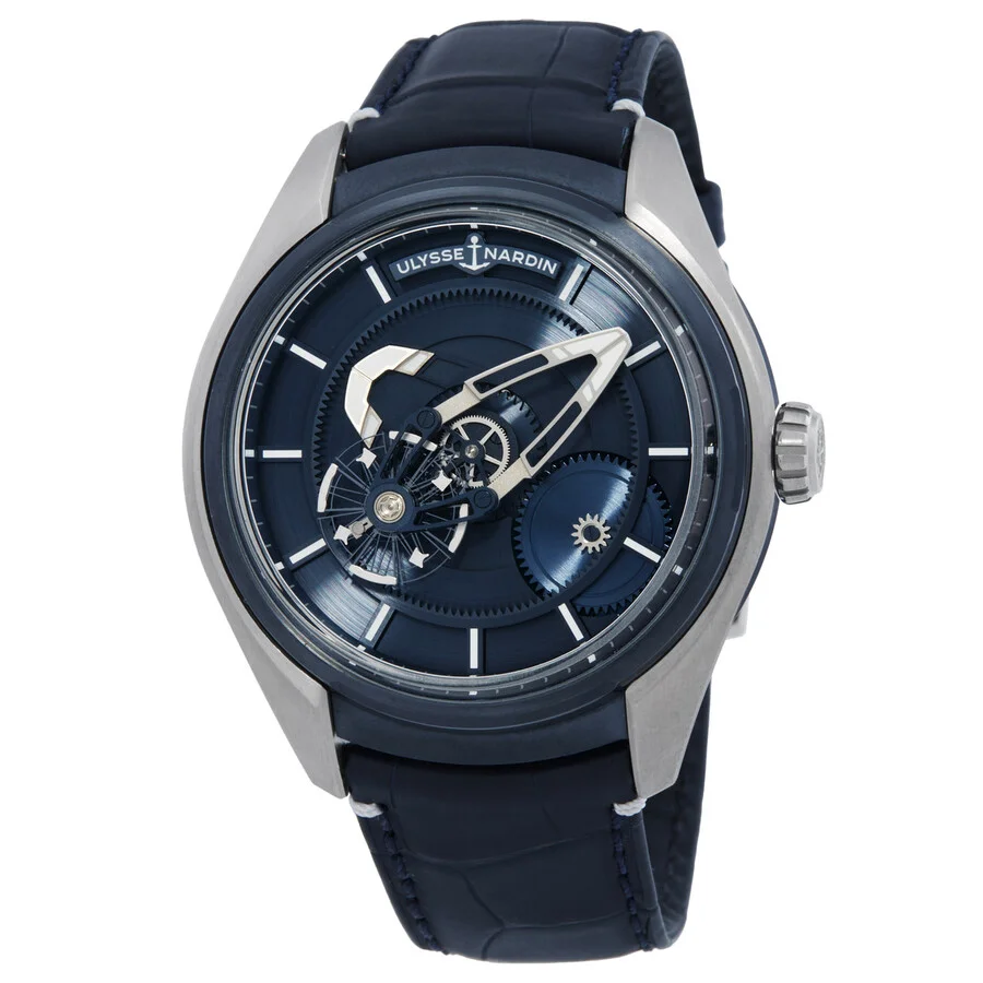 Grey titanium case with a blue alligator/crocodile leather strap. Fixed blue bezel. Blue dial with silver-tone hands and index hour markers. Dial Type: Analog. Ulysse Nardin Calibre UN-230 Automatic movement, composed of 205 parts, bitting at 21600 vph, and has a power reserve of approximately 72 hours. Scratch resistant sapphire crystal. Transparent see through case back. Round case shape, case size: 43 mm. Push button deployant buckle clasp. Water resistant at 50 meters / 150 feet. Functions: flying carrousel, hour, minute. Freak X Series. Luxury watch style. Watch label: Swiss Made. Ulysse Nardin Freak X Automatic Blue Dial Men's Watch 2303-270/03. GENERAL Box Type: Original Box CASE Case Diameter: 43 mm Case Material: Titanium Case Shape: Round Case Back: Transparent See Through BAND Band Material: Alligator/Crocodile Leather Band Type: Strap Band Color: Blue Clasp: Push Button Deployant Buckle DIAL Dial Color: Blue Type: Analog Crystal: Scratch Resistant Sapphire Hands: Silver-tone Dial Markers: Index Bezel: Fixed Bezel Color: Blue INFORMATION Brand: Ulysse Nardin Series: Freak X Collection Name: Freak X Gender: Mens Model: 2303-270/03 Watch Label: Swiss Made Movement: Automatic Engine: Ulysse Nardin Calibre UN-230 Power Reserve: 72 hours FEATURES Water Resistance: 50 meters / 150 feet Functions: Flying Carrousel, Hour, Minute Watch Features: Alligator Leather, Analog, Leather, Titanium ADDITIONAL INFO Watch Style: Luxury Warranty: 2 Year Jomashop Warranty Jomashop Sku: UN2303-270-03 Department: Watches Category: Watches