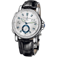 Silver-tone stainless steel case with a black leather strap. Fixed silver-tone diamond set bezel. Silver dial with luminous hands and index hour markers. Minute markers around the outer rim. Dial Type: Analog. Luminescent hands and markers. Date display at the 2 o'clock position. Small seconds sub-dials subdials. Ulysse Nardin Calibre UN-24 Automatic movement, containing 34 Jewels, bitting at 28800 vph, and has a power reserve of approximately 42 hours. Scratch resistant sapphire crystal. Screw down crown. Round case shape, case size: 42 mm, case thickness: 12 mm. Deployment clasp. Water resistant at 100 meters / 330 feet. Functions: GMT, second time zone, date, hour, minute, second. Gmt Big Date Series. Luxury watch style. Watch label: Swiss Made. Ulysse Nardin GMT Big Date Silver Dial Stainless Steel Black Leather Men's Watch 243-55B-91. GENERAL Color: Black / Silver CASE Case Size: 42 Case Thickness: 12 mm Case Material: Stainless Steel Case Shape: Round BAND Band Material: Leather Band Type: Strap Band Color: Black Clasp: Deployment DIAL Dial Color: Silver Type: Analog Crystal: Scratch Resistant Sapphire Hands: Luminous Dial Markers: Index Second Markers: Minute Markers around the outer rim Sub Dials: One - Small Second Luminiscence: Hands and Markers Bezel: Fixed Bezel Color: Silver-tone Bezel Material: Diamond Set Crown: Screw Down INFORMATION Brand: Ulysse Nardin Series: Gmt Big Date Collection Name: GMT Big Date Gender: Mens Model: 243-55b/91 Watch Label: Swiss Made Movement: Automatic Engine: Ulysse Nardin Calibre UN-24 Power Reserve: 42 hours FEATURES Water Resistance: 100 meters / 330 feet Calendar: Date display at the 2 o'clock position Functions: GMT, Second Time Zone, Date, Hour, Minute, Second Watch Features: Analog, GMT, Leather, Stainless Steel, Diamond, Time Zone ADDITIONAL INFO Watch Style: Luxury Warranty: 2 Year Jomashop Warranty Jomashop Sku: UN243-55B-91 Department: Watches Category: Watches
