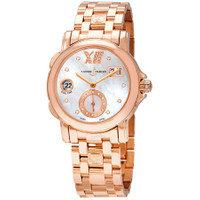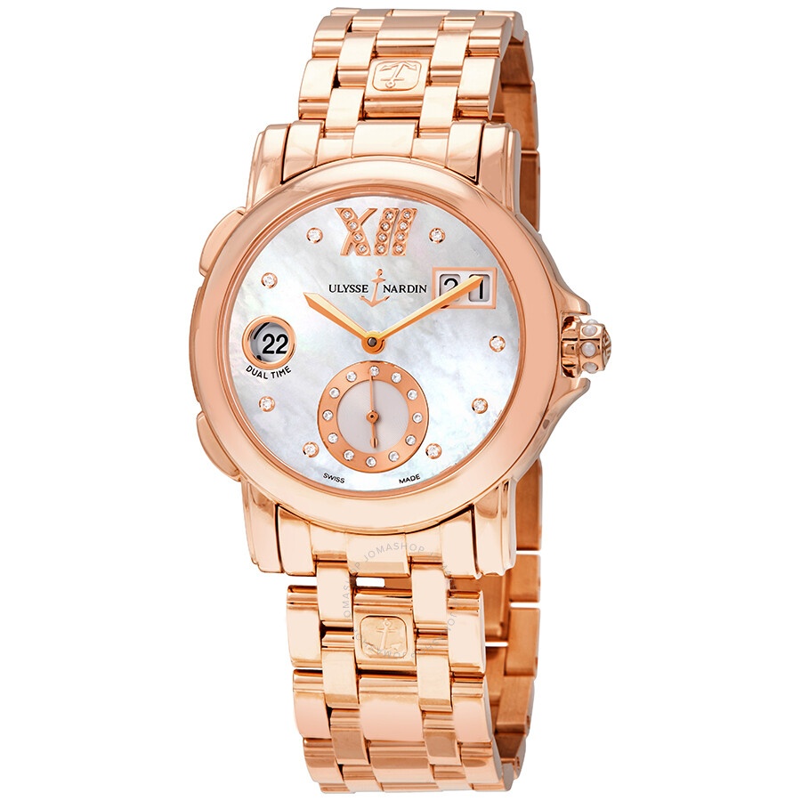 18kt rose gold case with a rose gold-tone 18kt polished rose gold bracelet. Fixed 18kt rose gold bezel. Mother of pearl dial with rose gold-tone sword-shaped hands and diamond-Roman numeral hour markers. Dial Type: Analog. Date display at the 2 o'clock position. One subdial displaying: small second. Ulysse Nardin Calibre UN-24 Automatic movement, containing 34 Jewels, bitting at 28800 vph, and has a power reserve of approximately 42 hours. Scratch resistant sapphire crystal. Screw down crown. Skeleton transparent exhibition see through case back. Round case shape, case size: 37 mm. Fold over with safety release clasp. Water resistant at 100 meters / 330 feet. Functions: GMT, second time zone, date, hour, minute, second. Gmt Dual Time Series. Dress watch style. Watch label: Swiss Made. Item Variations: 246 22 8 391, 246.22.8.391, 246228391. Ulysse Nardin GMT Dual Time Mother of Pearl Dial 18kt Polished Rose Gold Automatic Ladies Watch 246-22-8-391. GENERAL Color: Gold / Mother of pearl / Rose / Skeleton INFORMATION Brand: Ulysse Nardin Series: Gmt Dual Time Collection Name: GMT Dual Time Gender: Womens Model: 246-22-8-391 Watch Label: Swiss Made Movement: Automatic Engine: Ulysse Nardin Calibre UN-24 Power Reserve: 42 hours CASE Case Size: 37 mm Case Material: 18kt Rose Gold Case Shape: Round Case Back: Skeleton Transparent Exhibition See Through BAND Band Material: 18kt Polished Rose Gold Band Type: Bracelet Band Color: Rose Gold-tone Clasp: Fold Over with Safety Release DIAL Dial Color: Mother of Pearl Type: Analog Crystal: Scratch Resistant Sapphire Hands: Rose Gold-tone Sword-shaped Dial Markers: Diamond-Roman Numeral Sub Dials: One - Small Second Bezel: Fixed Bezel Material: 18kt Rose Gold Crown: Screw Down FEATURES Water Resistance: 100 meters / 330 feet Calendar: Date display at the 2 o'clock position Functions: GMT, Second Time Zone, Date, Hour, Minute, Second Watch Features: Time Zone, Diamond, Gold, GMT, Analog ADDITIONAL INFO Watch Style: Dress Warranty: 2 Year Jomashop Warranty Jomashop Sku: UN246-22-8-391 Item Variation: 246 22 8 391, 246.22.8.391, 246228391 Department: Watches Category: Watches