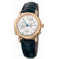 18kt rose gold case with a black leather strap. Fixed 18kt rose gold bezel. Silver dial with luminous blue leaf-style shape hands and index hour markers. Minute markers around the outer rim. Dial Type: Analog. Luminescent hands and markers. Date display at the 1 o'clock position. One - small second subdial. Ulysse Nardin Calibre UN-32 Automatic movement, containing 34 Jewels, bitting at 28800 vph, and has a power reserve of approximately 48 hours. Scratch resistant sapphire crystal. Pull / push crown. Round case shape, case size: 38.5 mm, case thickness: 12.5 mm. Deployment clasp. Water resistant at 30 meters / 100 feet. Functions: year, month, date, day, hour, minute, second, GMT, second time zone, chronometer, perpetual calendar. Gmt Perpetual Series. Luxury watch style. Watch label: Swiss Made. Item Variations: 326 22, 326.22, 32622. Ulysse Nardin GMT Perpetual Silver Dial 18kt Rose Gold Black Leather Men's Watch 326-22. GENERAL Color: Black / Gold / Rose / Silver CASE Case Size: 38 Case Thickness: 12.5 mm Case Material: 18kt Rose Gold Case Shape: Round BAND Band Material: Leather Band Type: Strap Band Color: Black Clasp: Deployment DIAL Dial Color: Silver Type: Analog Crystal: Scratch Resistant Sapphire Hands: Luminous Blue Leaf-style shape Dial Markers: Index Second Markers: Minute Markers around the outer rim Sub Dials: One - Small Second Luminiscence: Hands and Markers Bezel: Fixed Bezel Material: 18kt Rose Gold Crown: Pull / Push INFORMATION Brand: Ulysse Nardin Series: Gmt Perpetual Collection Name: GMT Perpetual Gender: Mens Model: 326-22 Watch Label: Swiss Made Movement: Automatic Engine: Ulysse Nardin Calibre UN-32 Power Reserve: 48 hours FEATURES Water Resistance: 30 meters / 100 feet Calendar: Date display at the 1 o'clock position Functions: Year, Month, Date, Day, Hour, Minute, Second, GMT, Second Time Zone, Chronometer, Perpetual Calendar Watch Features: Analog, GMT, Chronometer, Month, Perpetual, Gold, Leather, Time Zone ADDITIONAL INFO Watch Style: Luxury Warranty: 2 Year Jomashop Warranty Jomashop Sku: UN326-22 Item Variation: 326 22, 326.22, 32622 Department: Watches Category: Watches