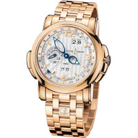 18kt rose gold case with a rose gold-tone 18kt rose gold bracelet. Fixed 18kt rose gold bezel. Silver dial with skeleton blue hands and index hour markers. Gmt markers around the outer rim. Dial Type: Analog. Date display at the 1 o'clock position. One - small second subdial. Ulysse Nardin Calibre UN-32 Automatic movement, containing 34 Jewels, bitting at 28800 vph, and has a power reserve of approximately 48 hours. Scratch resistant sapphire crystal. Pull / push crown. Round case shape, case size: 42 mm. Deployment clasp. Water resistant at 30 meters / 100 feet. Functions: year, month, date, day, hour, minute, second, GMT, second time zone, chronometer, perpetual calendar. Gmt Perpetual Series. Luxury watch style. Watch label: Swiss Made. Ulysse Nardin GMT Perpetual Silver Dial 18kt Rose Gold Men's Watch 326-60-8-60. GENERAL Color: Gold / Rose / Silver / Skeleton CASE Case Size: 42 Case Material: 18kt Rose Gold Case Shape: Round BAND Band Material: 18kt Rose Gold Band Type: Bracelet Band Color: Rose Gold-tone Clasp: Deployment DIAL Dial Color: Silver Type: Analog Crystal: Scratch Resistant Sapphire Hands: Skeleton Blue Dial Markers: Index Second Markers: GMT Markers around the outer rim Sub Dials: One - Small Second Bezel: Fixed Bezel Material: 18kt Rose Gold Crown: Pull / Push INFORMATION Brand: Ulysse Nardin Series: Gmt Perpetual Collection Name: GMT Perpetual Gender: Mens Model: 326-60-8/60 Watch Label: Swiss Made Movement: Automatic Engine: Ulysse Nardin Calibre UN-32 Power Reserve: 48 hours FEATURES Water Resistance: 30 meters / 100 feet Calendar: Date display at the 1 o'clock position Functions: Year, Month, Date, Day, Hour, Minute, Second, GMT, Second Time Zone, Chronometer, Perpetual Calendar Watch Features: Analog, GMT, Chronometer, Month, Perpetual, Gold, Time Zone ADDITIONAL INFO Watch Style: Luxury Warranty: 2 Year Jomashop Warranty Jomashop Sku: UN326-60-8-60 Department: Watches Category: Watches