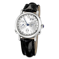 18kt white gold case with a black leather strap. Fixed 18kt white gold bezel. Silver dial with luminous blue leaf-style shape hands and index hour markers. Minute markers around the outer rim. Dial Type: Analog. Luminescent hands and markers. Date display at the 1 o'clock position. One - small second subdial. Ulysse Nardin Calibre UN-32 Automatic movement, containing 34 Jewels, bitting at 28800 vph, and has a power reserve of approximately 48 hours. Scratch resistant sapphire crystal. Pull / push crown. Transparent see through case back. Round case shape, case size: 38.5 mm, case thickness: 12.5 mm. Band length: 9.25 inches. Deployment clasp. Water resistant at 30 meters / 100 feet. Functions: year, month, date, day, hour, minute, second, GMT, second time zone, chronometer, perpetual calendar. Gmt Perpetual Series. Luxury watch style. Watch label: Swiss Made. Ulysse Nardin GMT Perpetual Silver Dial 18kt White Gold Black Leather Men's Watch 320-22-31. GENERAL Color: Black / Gold / Silver / White CASE Case Size: 38 Case Thickness: 12.5 mm Case Material: 18kt White Gold Case Shape: Round Case Back: Transparent See Through BAND Band Material: Leather Band Type: Strap Band Color: Black Band Length: 9.25 inches Clasp: Deployment DIAL Dial Color: Silver Type: Analog Crystal: Scratch Resistant Sapphire Hands: Luminous Blue Leaf-style shape Dial Markers: Index Second Markers: Minute Markers around the outer rim Sub Dials: One - Small Second Luminiscence: Hands and Markers Bezel: Fixed Bezel Material: 18kt White Gold Crown: Pull / Push INFORMATION Brand: Ulysse Nardin Series: Gmt Perpetual Collection Name: GMT Perpetual Gender: Mens Model: 320-22/31 Watch Label: Swiss Made Movement: Automatic Engine: Ulysse Nardin Calibre UN-32 Power Reserve: 48 hours FEATURES Water Resistance: 30 meters / 100 feet Calendar: Date display at the 1 o'clock position Functions: Year, Month, Date, Day, Hour, Minute, Second, GMT, Second Time Zone, Chronometer, Perpetual Calendar Watch Features: Analog, GMT, Chronometer, Month, Perpetual, Gold, Leather, Time Zone ADDITIONAL INFO Watch Style: Luxury Warranty: 2 Year Jomashop Warranty Jomashop Sku: UN320-22-31 Department: Watches Category: Watches