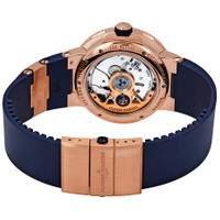 18kt rose gold case with a blue rubber strap with 18kt rose gold elements. Fixed coin edge 18kt rose gold bezel. Blue dial with rose gold spade-shape hands and Arabic numeral hour markers. Minute markers around the outer rim. Dial Type: Analog. Luminescent hands. Date display at the 6 o'clock position. Two displays showing: seconds and power reserve. Ulysse Nardin calibre UN-118 automatic movement, based upon Ulysse Nardin UN-66, containing 50 Jewels, bitting at 28800 vph, and has a power reserve of approximately 60 hours. Scratch resistant sapphire crystal. Screw down crown. Skeleton case back. Round case shape. Case size: 43 mm. Case thickness: 13 mm. Strap width: 23 mm. Deployment clasp. Water resistant at 100 meters / 330 feet. Functions: date, hour, minute, second, power reserve indicator, chronometer. Marine Chronometer Series. Luxury watch style. Watch label: Swiss Made. Ulysse Nardin Marine Chronometer Manufacture Blue Dial Blue Rubber Men's Watch 11861263/63. CASE Case Size: 43 Case Thickness: 14 mm Case Material: 18kt Rose Gold Case Shape: Round Case Back: Skeleton BAND Band Material: Rubber Band Type: Strap Band Color: Blue Band Width: 23 mm Clasp: Deployment DIAL Dial Color: Blue Type: Analog Crystal: Scratch Resistant Sapphire Hands: Rose Gold Spade-shape Dial Markers: Arabic Numeral Second Markers: Minute Markers around the outer rim Sub Dials: Two - Small Second and Power Reserve Indicator Luminiscence: Hands Bezel: Fixed Coin Edge Bezel Material: 18kt Rose Gold Crown: Screw Down INFORMATION Brand: Ulysse Nardin Series: Marine Chronometer Collection Name: Marine Chronometer Gender: Mens Model: 11861263/63 Watch Label: Swiss Made Movement: Automatic Engine: Ulysse Nardin Calibre UN-118 Power Reserve: 60 hours FEATURES Water Resistance: 100 meters / 330 feet Calendar: Date display at the 6 o'clock position Functions: Date, Hour, Minute, Second, Power Reserve Indicator, Chronometer Watch Features: Rubber, Gold, Chronometer, Power Reserve Indicator, Analog ADDITIONAL INFO Watch Style: Luxury Warranty: 2 Year Jomashop Warranty Jomashop Sku: UN1186-126-3-63 Department: Watches Category: Watches