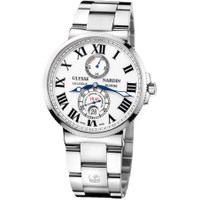 Silver-tone stainless steel case with a silver-tone stainless steel bracelet. Fixed silver-tone stainless steel bezel. White dial with blue-toned spade-shape hands and Roman numeral hour markers. Minute markers around the outer rim. Dial Type: Analog. Luminescent hands and markers. Date display at the 6 o'clock position. Two sub-dials displaying: small second and power reserve indicator. Ulysse Nardin Calibre UN-26 Automatic movement, containing 28 Jewels, bitting at 28800 vph, and has a power reserve of approximately 42 hours. Scratch resistant sapphire crystal. Screw down crown. Round case shape, case size: 43 mm, case thickness: 12 mm. Fold over with push button release clasp. Water resistant at 200 meters / 660 feet. Functions: date, hour, minute, second, power reserve indicator, chronometer. Maxi Marine Chronometer Series. Luxury watch style. Watch label: Swiss Made. Ulysse Nardin Maxi Marine Chronometer White Dial Stainless Steel Automatic Men's Watch 263-67-7-40. GENERAL Color: White CASE Case Size: 43 Case Thickness: 12 mm Case Material: Stainless Steel Case Shape: Round BAND Band Material: Stainless Steel Band Type: Bracelet Band Color: Silver-tone Clasp: Fold Over with Push Button Release DIAL Dial Color: White Type: Analog Crystal: Scratch Resistant Sapphire Hands: Blue-toned Spade-shape Dial Markers: Roman Numeral Second Markers: Minute Markers around the outer rim Sub Dials: Two - Small Second and Power Reserve Indicator Luminiscence: Hands and Markers Bezel: Fixed Bezel Color: Silver-tone Bezel Material: Stainless Steel Crown: Screw Down INFORMATION Brand: Ulysse Nardin Series: Maxi Marine Chronometer Collection Name: Maxi Marine Chronometer Gender: Mens Model: 263-67-7/40 Watch Label: Swiss Made Movement: Automatic Engine: Ulysse Nardin Calibre UN-26 Power Reserve: 42 hours FEATURES Water Resistance: 200 meters / 660 feet Calendar: Date display at the 6 o'clock position Functions: Date, Hour, Minute, Second, Power Reserve Indicator, Chronometer Watch Features: Stainless Steel, Chronometer, Power Reserve Indicator, Analog ADDITIONAL INFO Watch Style: Luxury Warranty: 2 Year Jomashop Warranty Jomashop Sku: UN263-67-7-40 Department: Watches Category: Watches