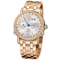 18kt rose gold case with a rose gold-tone 18kt rose gold bracelet. Fixed 18kt rose gold diamond set bezel. Silver dial with luminous blue leaf-style shape hands and Roman numeral hour markers. Minute markers around the outer rim. Dial Type: Analog. Date display at the 1 o'clock position. One - small second subdial. Ulysse Nardin Calibre UN-32 Automatic movement, containing 34 Jewels, bitting at 28800 vph, and has a power reserve of approximately 48 hours. Scratch resistant sapphire crystal. Pull / push crown. Round case shape, case size: 38.5 mm, case thickness: 12.5 mm. Hidden fold over clasp. Functions: year, month, date, day, hour, minute, second, GMT, second time zone, chronometer, perpetual calendar. Gmt Perpetual Series. Luxury watch style. Watch label: Swiss Made. Item Variations: 326 28 8, 326.28.8, 326288. Ulysse Nardin Perpetual Silver Dial 18kt Rose Gold Men's Watch 326-28-8. GENERAL Color: Gold / Rose / Silver CASE Case Size: 38 Case Thickness: 12.5 mm Case Material: 18kt Rose Gold Case Shape: Round BAND Band Material: 18kt Rose Gold Band Type: Bracelet Band Color: Rose Gold-tone Clasp: Hidden Fold Over DIAL Dial Color: Silver Type: Analog Crystal: Scratch Resistant Sapphire Hands: Luminous Blue Leaf-style shape Dial Markers: Roman Numeral Second Markers: Minute Markers around the outer rim Sub Dials: One - Small Second Bezel: Fixed Bezel Color: 18kt Rose Gold Bezel Material: Diamond Set Crown: Pull / Push INFORMATION Brand: Ulysse Nardin Series: Gmt Perpetual Collection Name: GMT Perpetual Gender: Mens Model: 326-28-8 Watch Label: Swiss Made Movement: Automatic Engine: Ulysse Nardin Calibre UN-32 Power Reserve: 48 hours FEATURES Calendar: Date display at the 1 o'clock position Functions: Year, Month, Date, Day, Hour, Minute, Second, GMT, Second Time Zone, Chronometer, Perpetual Calendar Watch Features: Analog, GMT, Chronometer, Month, Perpetual, Gold, Diamond, Time Zone ADDITIONAL INFO Watch Style: Luxury Warranty: 2 Year Jomashop Warranty Jomashop Sku: UN326-28-8 Item Variation: 326 28 8, 326.28.8, 326288 Department: Watches Category: Watches