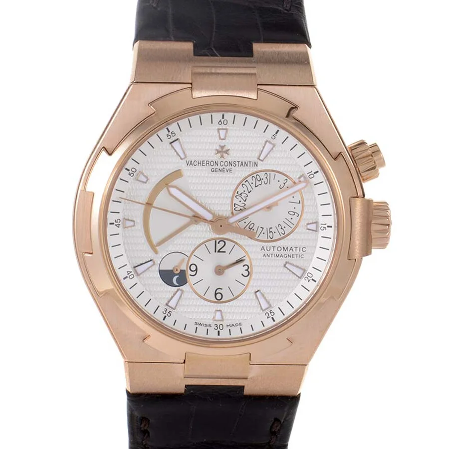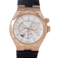 Rose gold-tone 18kt rose gold case with a dark brown leather strap. Fixed rose gold-tone 18kt rose gold bezel. Silver dial with gold-tone hands and index hour markers. Minute markers around the outer rim. Dial Type: Analog. Luminescent hands and markers. Date display at the 2 o'clock position. Four sub-dials displaying: date, second time zone, day/night indicator and power reserve indicator. Vacheron Constantin Calibre 1222 SC Automatic movement, based upon Jaeger-LeCoultre 889, containing 34 Jewels, composed of 153 parts, bitting at 28800 vph, and has a power reserve of approximately 40 hours. Scratch resistant sapphire crystal. Screw down crown. Solid case back. Round case shape, case size: 42 mm, case thickness: 12.45 mm. Deployment clasp. Water resistant at 150 meters / 500 feet. Functions: date, second time zone, hour, minute, second, power reserve indicator, day/night indicator. Overseas Series. Luxury watch style. Watch label: Swiss Made. Item Variations: 47450000R-9404 , 47450/000R-9404 , X47R1767. Pre-owned Vacheron Constantin Overseas Silver Dial Men's Watch 47450/000R-9404. GENERAL Preowned Item Condition: Excellent CASE Case Thickness: 12.45 mm Case Material: 18kt Rose Gold Case Shape: Round Case Back: Solid BAND Band Material: Leather Band Type: Strap Band Color: Dark Brown Clasp: Deployment DIAL Dial Color: Silver Type: Analog Crystal: Scratch Resistant Sapphire Hands: Gold-tone Dial Markers: Index Second Markers: Minute Markers around the outer rim Sub Dials: Four - Date, Second Time Zone, Day/Night Indicator and Power Reserve Indicator Luminiscence: Hands and Markers Bezel: Fixed Bezel Color: Rose Gold-tone Bezel Material: 18kt Rose Gold Crown: Screw Down INFORMATION Brand: Vacheron Constantin Series: Overseas Collection Name: Overseas Gender: Mens Model: 47450/000R-9404 Watch Label: Swiss Made Movement: Automatic Engine: Vacheron Constantin Calibre 1222 SC Power Reserve: 40 hours FEATURES Water Resistance: 150 meters / 500 feet Calendar: Date display at the 2 o'clock position Functions: Date, Second Time Zone, Hour, Minute, Second, Power Reserve Indicator, Day/Night Indicator Watch Features: Analog, Day/Night Indicator, Power Reserve Indicator, Gold, Leather, Time Zone ADDITIONAL INFO Watch Style: Luxury Warranty: 1 Year Jomashop Warranty Jomashop Sku: PRE-P-VC101766 Item Variation: 47450000R-9404 , 47450/000R-9404 , X47R1767 Department: Watches Category: Watches