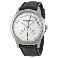 Pre-owned 18kt white gold case with a black alligator leather strap. Fixed 18kt white gold bezel. Silver dial with white gold hands and white gold hour markers. Minute markers around the outer rim. Dial Type: Analog. Date display centered on 12 o'clock position. day of the week centered on the 6 o'clock position. One subdial displaying: retrograde day. Vacheron Constantin Calibre 2460 R31R7 Automatic movement, containing 27 Jewels, composed of 283 parts, bitting at 28800 vph, and has a power reserve of approximately 40 hours. Scratch resistant sapphire crystal. Pull / push crown. Transparent case back. Round case shape, case size: 42.5 mm. Band width: 20.3 mm, band length: 8 inches. Deployment clasp. Water resistant at 30 meters / 100 feet. Functions: retrograde, date, day, hour, minute. Patrimony Series. Luxury watch style. Watch label: Swiss Made. Item Variations: 86020000G-9508 , 86020/000G-9508 , X86G2699. Vacheron Constantin Patrimony Retrograde Day-Date Silver Dial Automatic Men's Watch 86020000G-9508. GENERAL Preowned Item Condition: Excellent CASE Case Material: 18kt White Gold Case Shape: Round Case Back: Transparent BAND Band Material: Alligator Leather Band Type: Strap Band Color: Black Band Width: 20.3 mm Clasp: Deployment DIAL Dial Color: Silver Type: Analog Crystal: Scratch Resistant Sapphire Hands: White Gold Dial Markers: White Gold Second Markers: Minute Markers around the outer rim Sub Dials: One - Retrograde Day Bezel: Fixed Bezel Material: 18kt White Gold Crown: Pull / Push INFORMATION Brand: Vacheron Constantin Series: Patrimony Collection Name: Patrimony Gender: Mens Model: 86020000G-9508 Watch Label: Swiss Made Movement: Automatic Engine: Vacheron Constantin Calibre 2460 R31R7 Power Reserve: 40 hours FEATURES Water Resistance: 30 meters / 100 feet Calendar: Date Display centered on 12 o'clock position. Day of the Week centered on the 6 o'clock position Functions: Retrograde, Date, Day, Hour, Minute Watch Features: Leather, Gold, Alligator Leather, Analog, Retrograde ADDITIONAL INFO Watch Style: Luxury Warranty: 1 Year Jomashop Warranty UPC Code: 7630007336678 Jomashop Sku: PRE-P-VC102033 Department: Watches Category: Watches