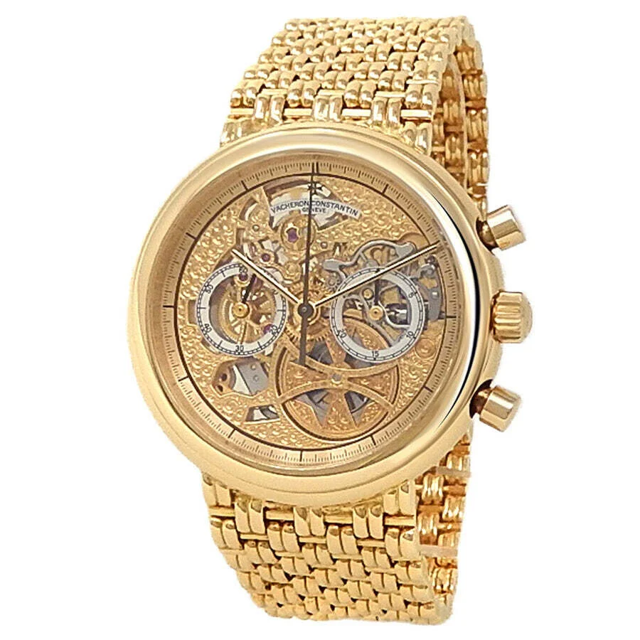 Yellow gold-tone 18kt yellow gold case and bracelet. Fixed yellow gold-tone 18kt yellow gold bezel. Transparent dial with yellow gold-tone hands and index hour markers. Minute markers around the outer rim. Dial Type: Analog. Hand wind movement. Transparent see through case back. Round case shape, case size: 38 mm. Band length: 7 inches. Fold over clasp with a safety release. Functions: chronograph, hour, minute, second. Patrimony Skeleton Chronograph Series. Dress watch style. Watch label: Swiss Made. Pre-owned Vacheron Constantin Patrimony Skeleton Chronograph Hand Wind Men's Watch 47100/236J-B7563. GENERAL Year: 1994 Preowned Item Condition: Excellent CASE Case Material: 18kt Yellow Gold Case Shape: Round Case Back: Transparent See Through BAND Band Material: 18kt Yellow Gold Band Type: Bracelet Band Color: Yellow Gold-tone Band Length: 7 inches Clasp: Fold Over with Safety Release DIAL Dial Color: Transparent Type: Analog Hands: Yellow Gold-tone Dial Markers: Index Second Markers: Minute Markers around the outer rim Bezel: Fixed Bezel Color: Yellow Gold-tone Bezel Material: 18kt Yellow Gold INFORMATION Brand: Vacheron Constantin Series: Patrimony Skeleton Chronograph Collection Name: Patrimony Skeleton Chronograph Gender: Mens Model: 47100/236J-B7563 Watch Label: Swiss Made Movement: Hand Wind FEATURES Functions: Chronograph, Hour, Minute, Second Watch Features: Analog, Gold, Chronograph ADDITIONAL INFO Watch Style: Dress Warranty: 1 Year Jomashop Warranty Jomashop Sku: PRE-P-VC100875 Department: Watches Category: Watches