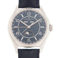 Silver-tone stainless steel case with a dark blue alligator leather strap. Fixed silver-tone stainless steel bezel. Blue dial with silver-tone hands and Arabic numeral and index hour markers. Minute scale around the inner rim. Dial Type: Analog. Luminescent hands and markers. Month, day at 12 o'clock position and date ring around outter rim. One subdial displaying: moonphase. Vacheron Constantin Calibre 2460 QCL/1 Automatic movement, containing 27 Jewels, composed of 308 parts, bitting at 28800 vph, and has a power reserve of approximately 40 hours. Scratch resistant sapphire crystal. Pull / push crown. Transparent case back. Round case shape, case size: 40 mm, case thickness: 11.60 mm. Deployant buckle clasp. Water resistant at 30 meters / 100 feet. Functions: complete calender, hour, minute, second, moonphase. Fifty Six Complete Calender Series. Luxury watch style. Watch label: Swiss Made. Vacheron Constantin Fifty Six Complete Calender Automatic Blue Dial Men's Watch 4000E/000A-B548. CASE Case Size: 40 Case Thickness: 11.60 mm Case Material: Stainless Steel Case Shape: Round Case Back: Transparent BAND Band Material: Alligator Leather Band Type: Strap Band Color: Dark Blue Clasp: Deployant Buckle DIAL Dial Color: Blue Type: Analog Crystal: Scratch Resistant Sapphire Hands: Silver-tone Dial Markers: Arabic Numeral and Index Second Markers: Minute Scale around the inner rim Sub Dials: One - Moonphase Luminiscence: Hands and Markers Bezel: Fixed Bezel Color: Silver-tone Bezel Material: Stainless Steel Crown: Pull / Push INFORMATION Brand: Vacheron Constantin Series: Fifty Six Complete Calender Collection Name: Fifty Six Complete Calender Gender: Mens Model: 4000E/000A-B548 Watch Label: Swiss Made Movement: Automatic Engine: Vacheron Constantin Calibre 2460 QCL/1 Power Reserve: 40 hours FEATURES Water Resistance: 30 meters / 100 feet Calendar: Month, Day at 12 o'clock position and Date ring around outter rim Functions: Complete Calender, Hour, Minute, Second, Moonphase Watch Features: Stainless Steel, Leather, Month, Analog, Alligator Leather ADDITIONAL INFO Watch Style: Luxury Warranty: 2 Year Jomashop Warranty Jomashop Sku: VC4000E000A-B548 Department: Watches Category: Watches