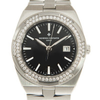 Silver-tone stainless steel case and bracelet. Fixed silver-tone bezel with diamond set stainless steel. Black dial with silver-tone hands and index hour markers. Minute markers around the outer rim. Dial Type: Analog. Luminescent hands and markers. Date display at the 3 o'clock position. Vacheron Constantin Calibre 1207 quartz movement. Scratch resistant sapphire crystal. Solid case back. Round case shape, case size: 33 mm. Deployment with push button release clasp. Water resistant at 50 meters / 165 feet. Functions: date, hour, minute, second. Overseas Series. Luxury watch style. Watch label: Swiss Made. Vacheron Constantin Overseas Quartz Diamond Black Dial Ladies Watch 1205V/100A-B591. INFORMATION Brand: Vacheron Constantin Series: Overseas Collection Name: Overseas Gender: Womens Model: 1205V/100A-B591 Watch Label: Swiss Made Movement: Quartz Engine: Vacheron Constantin Calibre 1207 CASE Case Size: 33 mm Case Material: Stainless Steel Case Shape: Round Case Back: Solid BAND Band Material: Stainless Steel Band Type: Bracelet Band Color: Silver-tone Clasp: Deployment with Push Button Release DIAL Dial Color: Black Type: Analog Crystal: Scratch Resistant Sapphire Hands: Silver-tone Dial Markers: Index Second Markers: Minute Markers around the outer rim Luminiscence: Hands and Markers Bezel: Fixed Bezel Color: Silver-tone Bezel Material: Diamond Set Stainless Steel FEATURES Water Resistance: 50 meters / 165 feet Calendar: Date display at the 3 o'clock position Functions: Date, Hour, Minute, Second Watch Features: Diamond, Stainless Steel, Analog ADDITIONAL INFO Watch Style: Luxury Warranty: 2 Year Jomashop Warranty Additional Info: Original Box, International Warranty Card, Manual (Complete Accessories) Jomashop Sku: VC1205V100AB591 Department: Watches Category: Watches
