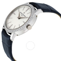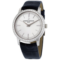 18kt white gold case with a dark blue leather strap. Fixed 18kt white gold bezel with diamond set. Silver dial with white dauphine-style shape hands and index hour markers. Minute markers around the outer rim. Dial Type: Analog. Vacheron Constantin Calibre 1400 Hand Wind movement, containing 20 Jewels, composed of 98 parts, bitting at 28800 vph, and has a power reserve of approximately 40 hours. Scratch resistant sapphire crystal. Pull / push crown. Transparent case back. Round case shape, case size: 33 mm, case thickness: 7.7 mm. Tang clasp. Water resistant at 30 meters / 100 feet. Functions: hour, minute. Traditionnelle Series. Luxury watch style. Watch label: Swiss Made. Item Variations: 81590000G-9848 , 81590/000G-9848 , X81G6355. Vacheron Constantin Traditionnelle Ladies Watch 81590/000G-9848. INFORMATION Brand: Vacheron Constantin Series: Traditionnelle Collection Name: Traditionnelle Gender: Womens Model: 81590/000G-9848 Watch Label: Swiss Made Movement: Hand Wind Engine: Vacheron Constantin Calibre 1400 Power Reserve: 40 hours CASE Case Size: 33 mm Case Thickness: 7.7 mm Case Material: 18kt White Gold Case Shape: Round Case Back: Transparent BAND Band Material: Leather Band Type: Strap Band Color: Dark Blue Clasp: Tang DIAL Dial Color: Silver Type: Analog Crystal: Scratch Resistant Sapphire Hands: White Dauphine-style shape Dial Markers: Index Second Markers: Minute Markers around the outer rim Bezel: Fixed Bezel Color: 18kt White Gold Bezel Material: Diamond Set Crown: Pull / Push FEATURES Water Resistance: 30 meters / 100 feet Functions: Hour, Minute Watch Features: Diamond, Leather, Gold, Analog ADDITIONAL INFO Watch Style: Luxury Warranty: 2 Year Jomashop Warranty UPC Code: 7630007364558 Jomashop Sku: VC81590000G-9848 Item Variation: 81590000G-9848 , 81590/000G-9848 , X81G6355 Department: Watches Category: Watches