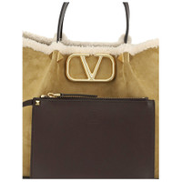 Valentino Ladies Tote. SKU: 7W0B0R44UVT_A8G. Valentino Garavani Suede And Sheepskin Medium Tote Bag. The suede and shearling medium tote bag by valentino garavani is a sophisticatedly styled shopping bag made of suede with shearling lining. featuring the signature metallic vlogo on the front, it has a removable leather shoulder strap with two iconic maxi studs at the ends. the studs and metal elements have an antiqued brass finish, enhancing the vintage aesthetic. a removable interior pouch and protective feet at the base complete the design. Composition: 100% % Leather. GENERAL Brand Type: Designer INFORMATION Brand: Valentino Garavani Gender: Womens Model: 7W0B0R44UVT_A8G ADDITIONAL INFO UPC Code: 8052576959130 Jomashop Sku: Z-XRKB2 Department: Bags Category: Tote Bags