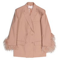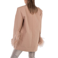 Valentino Ladies Outerwear. Fashion category: Blazers. SKU: CEE367TQS69. Color: Sand. Valentino Ladies Sand Feather Embroidered Jacket. A Valentino blazer jacket featuring feather detailing, peak lapels, a double-breasted button fastening, two side flap pockets, a chest welt pocket, long sleeves, and a straight hem. Outer: Polyester 100%, Ostrich Feather 100%. Lining: Silk 100%, Horse Hair 48%, Viscose 45%, Wool 43%, Polyester 34%, Cotton 18%, Goat Fur 12%. GENERAL Color: Sand INFORMATION Brand: Valentino Garavani Gender: Womens Model: CEE367TQS69 DETAILS Category: Outerwear Apparel Type: Blazers ADDITIONAL INFO Jomashop Sku: -VALCEE367TQS69 Department: Clothing