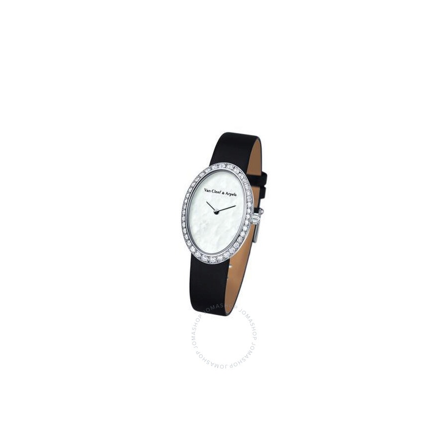 18kt white gold case with a black satin bracelet. Fixed 18kt white gold set with diamonds bezel. Mother of pearl dial with silver-tone hands. Quartz movement. Scratch resistant sapphire crystal. Solid case back. Round case shape. Tang clasp. Functions: hour, minutes. Luxury watch style. Van Cleef Arpels Timeless Watch WJWF01I9. INFORMATION Brand: Van Cleef & Arpels Series: Timeless Collection Name: Timeless Gender: Womens Model: WJWF01I9 Watch Label: Swiss Made Movement: Quartz CASE Case Size: 22 mm Case Material: 18kt White Gold Case Shape: Oval Case Back: Solid BAND Band Material: Satin Band Type: Strap Band Color: Black Clasp: Tang DIAL Dial Color: Mother of Pearl Type: Analog Crystal: Scratch Resistant Sapphire Hands: Silver-tone Bezel: Fixed Bezel Color: 18kt White Gold Bezel Material: Diamond Set FEATURES Water Resistance: 30 meters / 100 feet Functions: Hour, Minutes Watch Features: Diamond, Gold, Analog ADDITIONAL INFO Watch Style: Luxury Warranty: 2 Year Jomashop Warranty Jomashop Sku: VAN-WJWF01I9 Department: Watches Category: Watches
