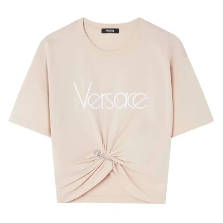 Versace Ladies Tops. Fashion category: T-Shirts & Henleys. SKU: 1018898-1A13610. Color: Champagne/White. Versace 1978 Re-Edition Logo Safety Pin T-Shirt. This T-shirt features a 1978 Re-Edition Logo embroidered on the front and is gathered at the waist with the signature Safety Pin hardware. Designed with a classic crewneck, short sleeves and a cropped design. 100% Cotton. Made in Portugal. GENERAL Brand Type: Designer Color: Champagne/White INFORMATION Brand: Versace Gender: Womens Model: 1018898-1A13610-CHAMPAGNE+WHITE DETAILS Category: Tops Apparel Type: T-Shirts & Henleys Material: Cotton ADDITIONAL INFO Jomashop Sku: -13610CHAMPAGNEWHITE Department: Clothing