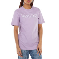 Versace Ladies Tops. Fashion category: T-Shirts & Henleys. SKU: 1012615-1A11594-MAUVE+WHITE. Color: Mauve/White. Versace 1978 Re-Edition Logo Short-Sleeve T-Shirt. Made from 100% cotton, this T-shirt features short sleeves, a crewneck, and an embroidered archival Versace logo from 1978, the year the House was founded. 100% Cotton. Trim: 97% Cotton, 3% Elastane. Embroidery: 100% Polyester. Made in Portugal. GENERAL Color: Mauve/White INFORMATION Brand: Versace Gender: Womens Model: 1012615-1A11594-MAUVE+WHITE DETAILS Category: Tops Apparel Type: T-Shirts & Henleys Material: Cotton ADDITIONAL INFO Jomashop Sku: -151A11594MAUVEWHITE Department: Clothing