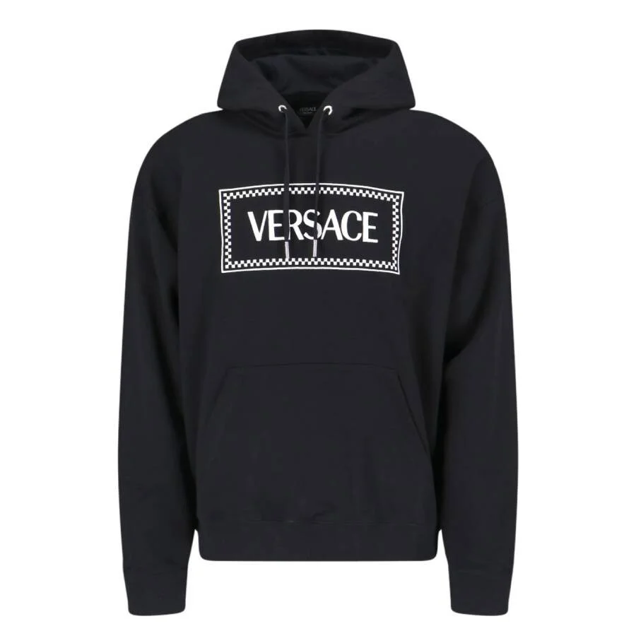 Versace Men's Tops. Fashion category: Hoodies & Sweatshirts. SKU: 10125641A09063-1B000. Color: Black. Versace 90s Vintage Logo Print Hoodie. This cotton jersey hooded sweatshirt features an embroidered ’90s Vintage Logo on the front for a retro-inspired look. Designed with long sleeves, a drawstring hood, and ribbed crewneck, hem, and cuffs, it combines casual comfort with timeless style. Outer: 100% Cotton. Embroidery: 100% Polyester. Made in Italy. GENERAL Brand Type: Designer Color: Black INFORMATION Brand: Versace Gender: Mens Model: 10125641A09063-1B000-BLACK DETAILS Category: Tops Apparel Type: Hoodies & Sweatshirts Material: Cotton ADDITIONAL INFO Jomashop Sku: -641A090631B000BLACK Department: Clothing