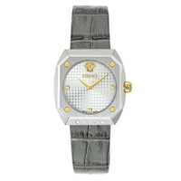 Silver-tone stainless steel case with a grey leather strap. Fixed silver-tone stainless steel bezel. Silver dial with gold-tone hands and index hour markers. Dial Type: Analog. Quartz movement. Scratch resistant sapphire crystal. Pull / push crown. Solid case back. Octogonal case shape, case size: 35 mm. Buckle clasp. Water resistant at 50 meters / 165 feet. Functions: hour, minute. Antares Series. Casual watch style. Watch label: Swiss Made. Versace Antares Quartz Silver Dial Ladies Watch VE9E00124. GENERAL Box Type: Original Box Brand Type: Designer CASE Case Material: Stainless Steel Case Back: Solid BAND Band Material: Leather Band Type: Strap Band Color: Grey Clasp: Buckle DIAL Dial Color: Silver Type: Analog Crystal: Scratch Resistant Sapphire Hands: Gold-tone Dial Markers: Index Bezel: Fixed Bezel Color: Silver-tone Bezel Material: Stainless Steel Crown: Pull / Push INFORMATION Brand: Versace Series: Antares Collection Name: Antares Gender: Womens Model: VE9E00124 Watch Label: Swiss Made Movement: Quartz FEATURES Water Resistance: 50 meters / 165 feet Functions: Hour, Minute Watch Features: Stainless Steel, Analog, Gold, Leather ADDITIONAL INFO Watch Style: Casual Warranty: 2 Year Jomashop Warranty Jomashop Sku: VER-VE9E00124 Department: Watches