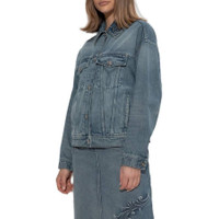 Versace Ladies Outerwear. Fashion category: Coats & Jackets. SKU: 1019590-1A14195-MEDIUM BLUE. Color: Medium Blue. Versace Barocco Denim Trucker Jacket. This jacket features a front button fastening, two chest flap pockets, and two side slit pockets, finished with buttoned cuffs for a polished, tailored look. 100% Cotton. Made in Italy. GENERAL Brand Type: Designer Color: Medium Blue INFORMATION Brand: Versace Gender: Womens Model: 1019590-1A14195-MEDIUM BLUE DETAILS Category: Outerwear Apparel Type: Coats & Jackets Material: Cotton ADDITIONAL INFO Jomashop Sku: -901A14195MEDIUMBLUE Department: Clothing
