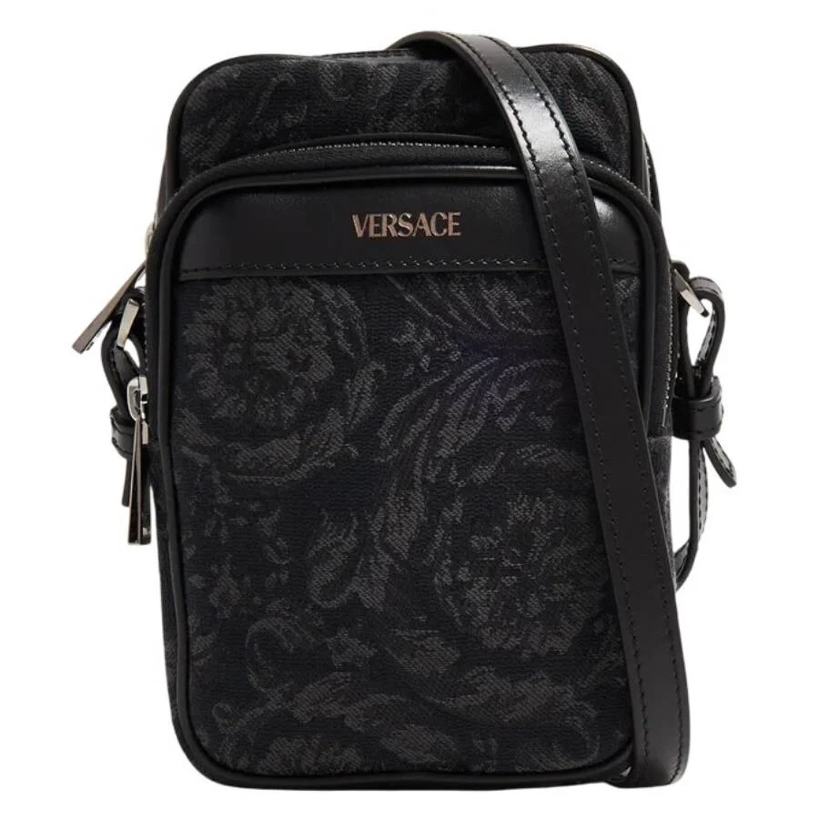 Versace Men's Crossbody. SKU: 1013531-1A09321_2BM0E. Color: Black/Ruthenium. Size: L 7.48" X H 5.12" X W 2.95". Versace Barocco Jacquard Crossbody Bag. This crossbody bag showcases the iconic Barocco print in a jacquard pattern, accented with leather trims. It features a detachable, adjustable shoulder strap and is finished with a front zipped pocket for added convenience. Material: 53% Nylon, 38% Cotton, 6% Polyester, 3% Acrylic. Made in Italy. GENERAL Size Info: L 7.48" X H 5.12" X W 2.95" Brand Type: Designer Item Variation: 1013531_1A09321-BLACK+RUTHENIUM Color: Black/Ruthenium INFORMATION Brand: Versace Gender: Mens Model: 1013531-1A09321_2BM0E DETAILS Material: Acrylic, Cotton, Nylon, Polyester Closure: Zip-Up DIMENSIONS Size: Small ADDITIONAL INFO UPC Code: 8056204851681 Jomashop Sku: Z-A9KTZ Department: Bags Category: Crossbody