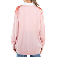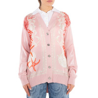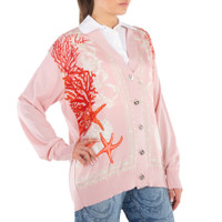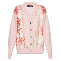 Versace Ladies Tops. Fashion category: Cardigans & Sweaters. SKU: 1016172-1A11288-DUSTY ROSE+CORAL+BO. Color: Dusty Rose/Coral/Bone. Versace Barocco Sea Panelled V-Neck Cardigan. This cardigan features a paneled design, signature Medusa Head buttons, and the iconic Barocco Sea print. Crafted with a V-neck, front button fastening, and long sleeves, it is finished with ribbed cuffs and hem for a refined touch. 70% Virgin Wool, 30% Silk. Made in Italy. GENERAL Color: Dusty Rose/Coral/Bone INFORMATION Brand: Versace Gender: Womens Model: 1016172-1A11288-DUSTY ROSE+CORAL+BO DETAILS Category: Tops Apparel Type: Cardigans & Sweaters Material: Silk, Wool ADDITIONAL INFO Jomashop Sku: -288DUSTYROSECORALBO Department: Clothing