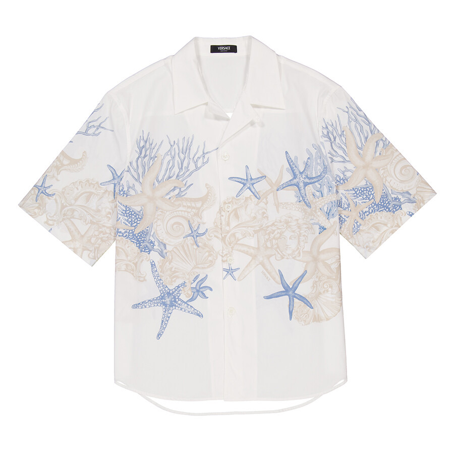 Versace Men's Tops. Fashion category: Casual Button-Downs. SKU: 1015699-1A11026-WHITE+DUSTY BLUE+BO. Color: White/Dusty Blue/Bone. Versace Barocco Sea Print Cotton Poplin Shirt. This cotton poplin shirt showcases a Barocco Sea print on the front and back, complete with short sleeves, a pointed collar, and a front button closure. 100% Cotton. Made in Italy. GENERAL Color: White/Dusty Blue/Bone INFORMATION Brand: Versace Gender: Mens Model: 1015699-1A11026-WHITE+DUSTY BLUE+BO DETAILS Category: Tops Apparel Type: Casual Button-Downs Material: Cotton ADDITIONAL INFO Jomashop Sku: -026WHITEDUSTYBLUEBO Department: Clothing