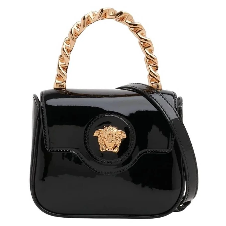 Versace Ladies Top Handle Bag. SKU: 1003016-1A02212-1B00V. Color: Black. Size: L 6.3" x H 4.7" x W 2.4". Versace Black Glossy Leather La Medusa Mini Bag. Crafted from glossy leather, this bag showcases a structured chain top handle and is embellished with a striking gold-tone Medusa emblem at the center. It includes an adjustable leather shoulder strap, La Medusa hardware, and a secure magnetic button closure, offering both style and functionality. 100% Calf Leather. Made in Italy. GENERAL Size Info: L 6.3" x H 4.7" x W 2.4" Brand Type: Designer Color: Black INFORMATION Brand: Versace Gender: Womens Model: 1003016-1A02212-1B00V DETAILS Material: Leather Closure: Magnetic Snap DIMENSIONS Size: Mini ADDITIONAL INFO UPC Code: 8052045840594 Jomashop Sku: Z-8J3CQ Department: Bags Category: Top Handle Bag