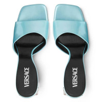 Versace Ladies Heels. SKU: 1019840-1A13826. Color: Pearl Blue-Palladium. Versace Bright Crystal 70 Patent Mules. These mules are crafted in shiny patent leather with an iridescent pearl finish and feature a playful reinterpretation of the Versace Bright Crystal fragrance at the heel. Designed with an open toe and slip-on style, they are accented with the signature Versace logo for a bold, luxurious touch. Outer: 100% Calf leather. Please visit the brand website for sizing information. GENERAL Brand Type: Designer INFORMATION Brand: Versace Model: 1019840-1A13826-PEARL BLUE-PALLADIU Gender: Womens DETAILS Category: Heels Shoe Style: Mules Shoe Style: Mules Color: Pearl Blue-Palladium Shoe Vamp Style: Slip-on Upper Material: Leather Sole Material: Leather Heel Size: 2.8" / 7 cm ADDITIONAL INFO Jomashop Sku: -26PEARLBLUEPALLADIU Department: Shoes