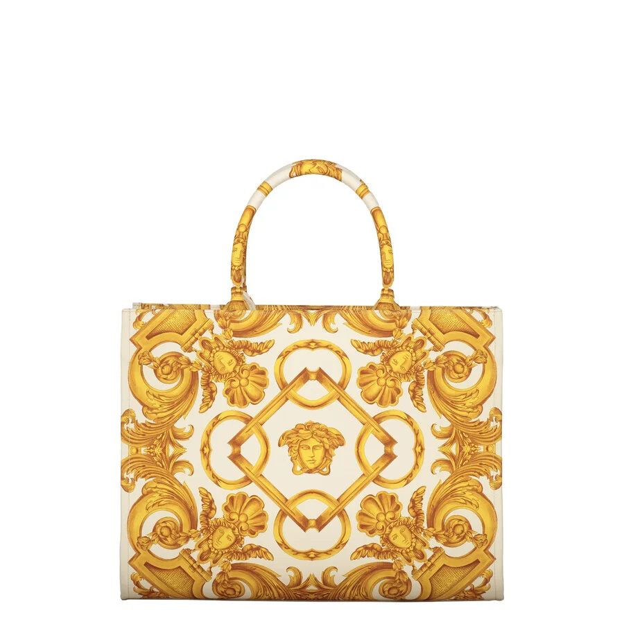 Versace Ladies Tote. SKU: 10145691A10399_2KM5V. Color: Ivory. Versace Canvas Tote Bag. Jacquard motif canvas itemtwo rigid handlesinternal zippered pocketremovable strapgold-tone metal hardwareleather insertscotton liningwidth: 39 cmheight: 29 cmdepth: 17 cmstrap: 105 cm100% polyester, 100% leather, 100% cotton. Composition: 100% % Polyester, 100% % Leather, 100% % Cotton. GENERAL Brand Type: Designer Color: Ivory INFORMATION Brand: Versace Gender: Womens Model: 10145691A10399_2KM5V ADDITIONAL INFO UPC Code: 8053609570612 Jomashop Sku: Z-9U55G Department: Bags Category: Tote Bags