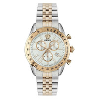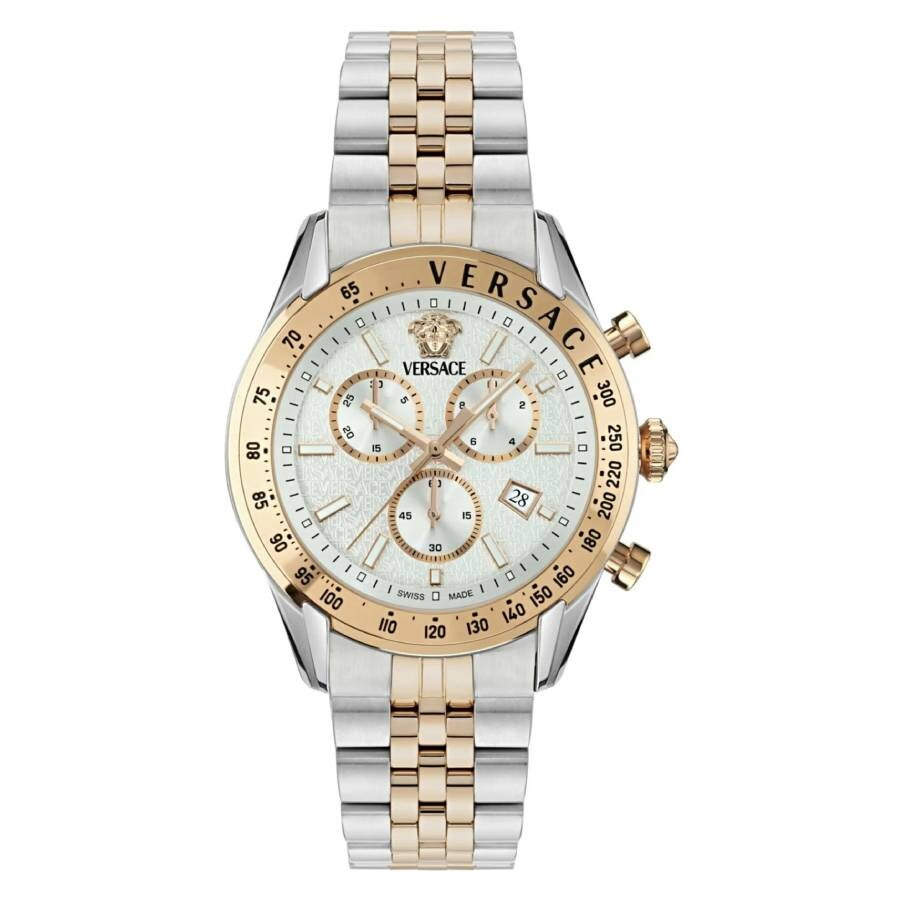 Silver-tone stainless steel case with a two-tone (silver-tone and rose gold-tone) stainless steel bracelet. Fixed rose gold-tone stainless steel bezel. Silver dial with rose gold-tone hands and index hour markers. Minute markers around the outer rim. Dial Type: Analog. Date display at the 4 o'clock position. Chronograph - three sub-dials displaying: 60 second, 30 minute and 1/10th of a second. Quartz movement. Scratch resistant sapphire crystal. Pull / push crown. Solid case back. Round case shape, case size: 44 mm. Deployment with push button release clasp. Water resistant at 50 meters / 165 feet. Functions: chronograph, date, hour, minute, second. Chrono Master Series. Sport watch style. Watch label: Swiss Made. Versace Chrono Master Quartz Silver Dial Men's Watch VE8R00424. GENERAL Box Type: Original Box Brand Type: Designer CASE Case Material: Stainless Steel Case Shape: Round Case Back: Solid BAND Band Material: Stainless Steel Band Type: Bracelet Band Color: Two-tone (Silver-tone and Rose Gold-tone) Clasp: Deployment with Push Button Release DIAL Dial Color: Silver Type: Analog Crystal: Scratch Resistant Sapphire Hands: Rose Gold-tone Dial Markers: Index Second Markers: Minute Markers around the outer rim Sub Dials: Three - 60 Second, 30 Minute and 1/10th of a Second Luminiscence: Hands and Markers Bezel: Fixed Bezel Color: Rose Gold-tone Bezel Material: Stainless Steel Crown: Pull / Push INFORMATION Brand: Versace Series: Chrono Master Collection Name: Chrono Master Gender: Mens Model: VE8R00424 Watch Label: Swiss Made Movement: Quartz FEATURES Water Resistance: 50 meters / 165 feet Calendar: Date display at the 4 o'clock position Functions: Chronograph, Date, Hour, Minute, Second Watch Features: Analog, Gold, Stainless Steel, Chronograph ADDITIONAL INFO Watch Style: Sport Warranty: 2 Year Jomashop Warranty UPC Code: 7630615151540 Jomashop Sku: VER-VE8R00424 Department: Watches