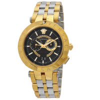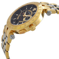 Gold ion-plated stainless steel case with a two-tone (silver and gold) stainless steel link bracelet bracelet. Fixed gold ion-plated stainless steel bezel. Black sunray (greca logo) dial with luminous gold-tone hands and index hour markers. Minute markers. Arabic numeral minute markers (at 5 minute intervals). Medusa head logo appears at the 12 o'clock position. Dial Type: Analog. Luminescent hands and markers. Date display at the 6 o'clock position. Chronograph - two sub-dials displaying: 12 hours and small seconds. Quartz movement. Scratch resistant sapphire crystal. Solid case back. Round case shape, case size: 46 mm. Band width: 20 mm. Butterfly clasp. Water resistant at 50 meters / 165 feet. Functions: chronograph, date, hour, minute, second. Dress watch style. Watch label: Swiss Made. Versace Chronograph Quartz Men's Watch VEBV00519. CASE Case Size: 46 Case Material: Stainless Steel Case Shape: Round Case Back: Solid BAND Band Material: Stainless Steel Band Type: Bracelet Band Color: Two-tone (Yellow Gold PVD and Silver-tone) Band Width: 20 mm Clasp: Butterfly DIAL Dial Color: Black (Greca Pattern) Type: Analog Crystal: Scratch Resistant Sapphire Hands: Luminous Gold-tone Dial Markers: Index Second Markers: Minute Markers. Arabic Numeral Minute Markers (at 5 minute intervals). Medusa Head logo appears at the 12 o'clock position Sub Dials: Two - 12 Hours and Small Seconds Luminiscence: Hands and Markers Bezel: Fixed Bezel Color: Yellow Gold PVD Bezel Material: Stainless Steel INFORMATION Brand: Versace Gender: Mens Model: VEBV00519 Watch Label: Swiss Made Movement: Quartz FEATURES Water Resistance: 50 meters / 165 feet Calendar: Date display at the 6 o'clock position Functions: Chronograph, Date, Hour, Minute, Second Watch Features: Chronograph, Stainless Steel, Gold, Analog ADDITIONAL INFO Watch Style: Dress Warranty: 2 Year Jomashop Warranty UPC Code: 7630030553509 Jomashop Sku: VER-VEBV00519 Department: Watches Category: Watches