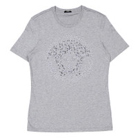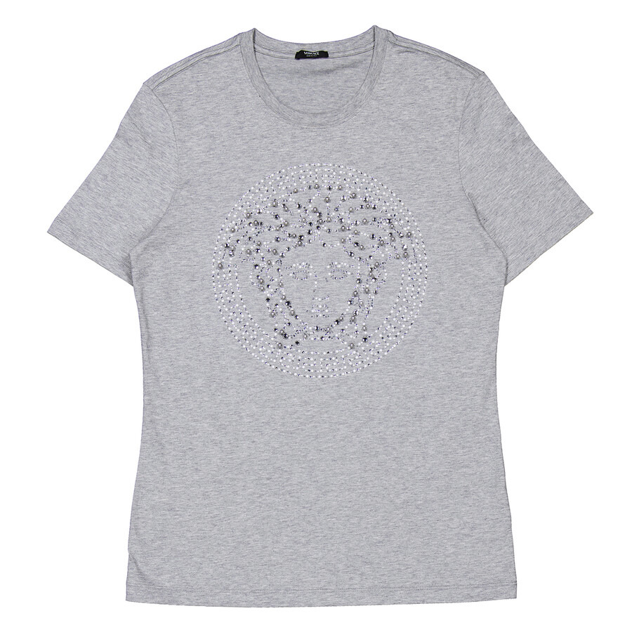 Versace Ladies Tops. Fashion category: T-Shirts & Henleys. SKU: 1014272-1A11599-LIGHT GREY. Color: Light Grey. Versace Crystal Medusa Embellished T-Shirt. Cotton T-Shirt by Versace, ribbed crew neck, iconic brand logo with contrasting shiny jewel detail on front, monochrome pattern, regular fit. 100% Cotton. Made in Italy. GENERAL Color: Light Grey INFORMATION Brand: Versace Gender: Womens Model: 1014272-1A11599-LIGHT GREY DETAILS Category: Tops Apparel Type: T-Shirts & Henleys Material: Cotton ADDITIONAL INFO Jomashop Sku: -2721A11599LIGHTGREY Department: Clothing