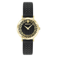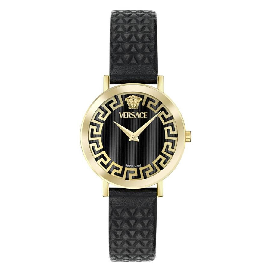 Gold-tone stainless steel case with a black leather strap. Fixed gold-tone stainless steel bezel. Black dial with gold-tone hands. Dial Type: Analog. Quartz movement. Scratch resistant sapphire crystal. Pull / push crown. Solid case back. Round case shape, case size: 35 mm. Buckle clasp. Water resistant at 50 meters / 165 feet. Functions: hour, minute. Daedalus Series. Casual watch style. Watch label: Swiss Made. Versace Daedalus Quartz Black Dial Ladies Watch VE9A00224. GENERAL Box Type: Original Box Brand Type: Designer CASE Case Material: Stainless Steel Case Shape: Round Case Back: Solid BAND Band Material: Leather Band Type: Strap Band Color: Black Clasp: Buckle DIAL Dial Color: Black Type: Analog Crystal: Scratch Resistant Sapphire Hands: Gold-tone Bezel: Fixed Bezel Color: Gold-tone Bezel Material: Stainless Steel Crown: Pull / Push INFORMATION Brand: Versace Series: Daedalus Collection Name: Daedalus Gender: Womens Model: VE9A00224 Watch Label: Swiss Made Movement: Quartz FEATURES Water Resistance: 50 meters / 165 feet Functions: Hour, Minute Watch Features: Analog, Gold, Leather, Stainless Steel ADDITIONAL INFO Watch Style: Casual Warranty: 2 Year Jomashop Warranty Jomashop Sku: VER-VE9A00224 Department: Watches